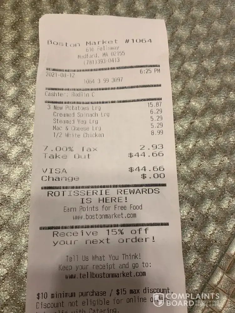 Boston Market earns a 1.0-star rating from 1 reviews and 209 complaints, showing that the majority of diners are dissatisfied with their meals.