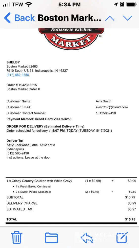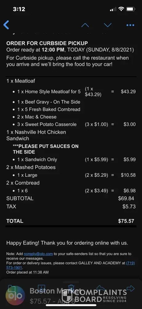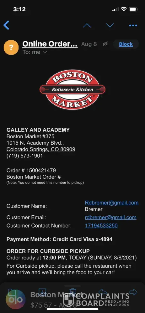 Boston Market Company account hacked and unauthorized order placed on my bill