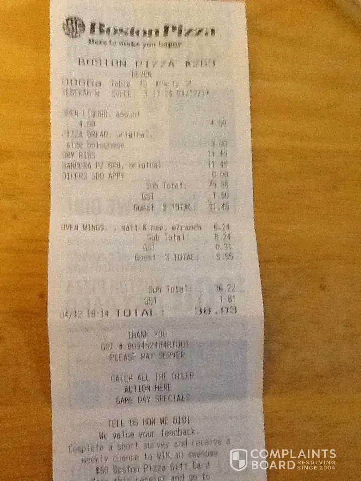 Boston Pizza International poor service - boycotting bp and now so are my business teams
