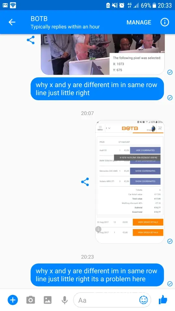 Same here, been playing for roughly a year. Not won a motor yet but have won game credit for being close. If you can't take to loosing a game then don't play. Remember, it's a game of fun, better odds than the lottery and "you" pick where you think the centre of the ball is. If your going to get annoyed then get annoyed with yourself, end of the day you picked the position and the coordinates no one else.