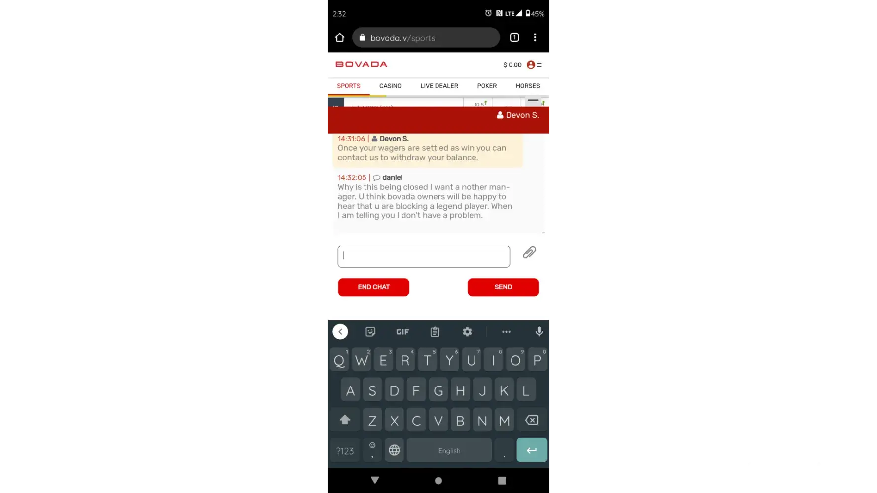 I am a legend member at bovada I have been for years I have spent tens of thousand dollars on this app the company has been having serious problem with glitches cyber attacks so I called to complain about a glitch issue will I texted them during that conversation with some random representative as I'm frustrated about how the conversation is going he asked me how the weather is there I stated I don't know I have not been outside I am a degenerate lol. It was a joke as well as a sarcastic remark. Now I never stated I want my uncle's or or that I have a gambling issue and I want my account close never did those words get put in my text I screenshot all the text messages now I want money and have money in my account they close my account with all good reason it will not open it again this company has been falling apart as of late it is losing numerous customers I'm sure sarcastic Carmen where I did not even make the statement close my account would not be happy with this now at this point I have money in that account and they are not giving me the option of withdrawing it as they can take my money whenever they want right away but when it comes to withdrawn now I have to figure out and I don't think I'll ever see that money I recommend nobody going to this company and I hope they a go out of business and be the federal government goes after this company cuz it is illegal all the money they have stole from me over the years they have deliberately made sure that the customer loses all the lines to the bedding are off when you put a wager in the system glitches and it takes your money with a different spread that you originally did not pick it has Arizona casino it probably has bought in their poker this company is totally rigged and I hope the government please read this message and goes after this company I am not the first I am not the last there are many thousands of players and people that have complained about this company please someone make it an issue and have it looked at and I hope one day I will get all my money back that I've given to this company after they have robbed me over the years