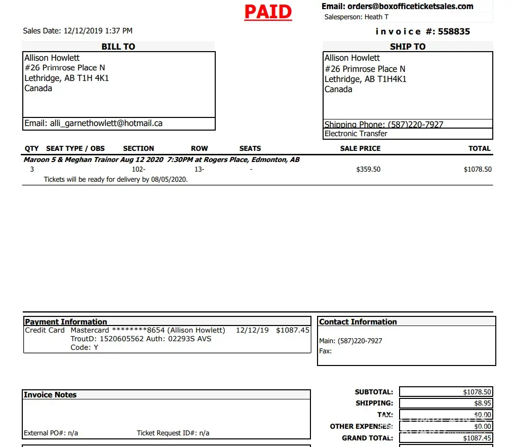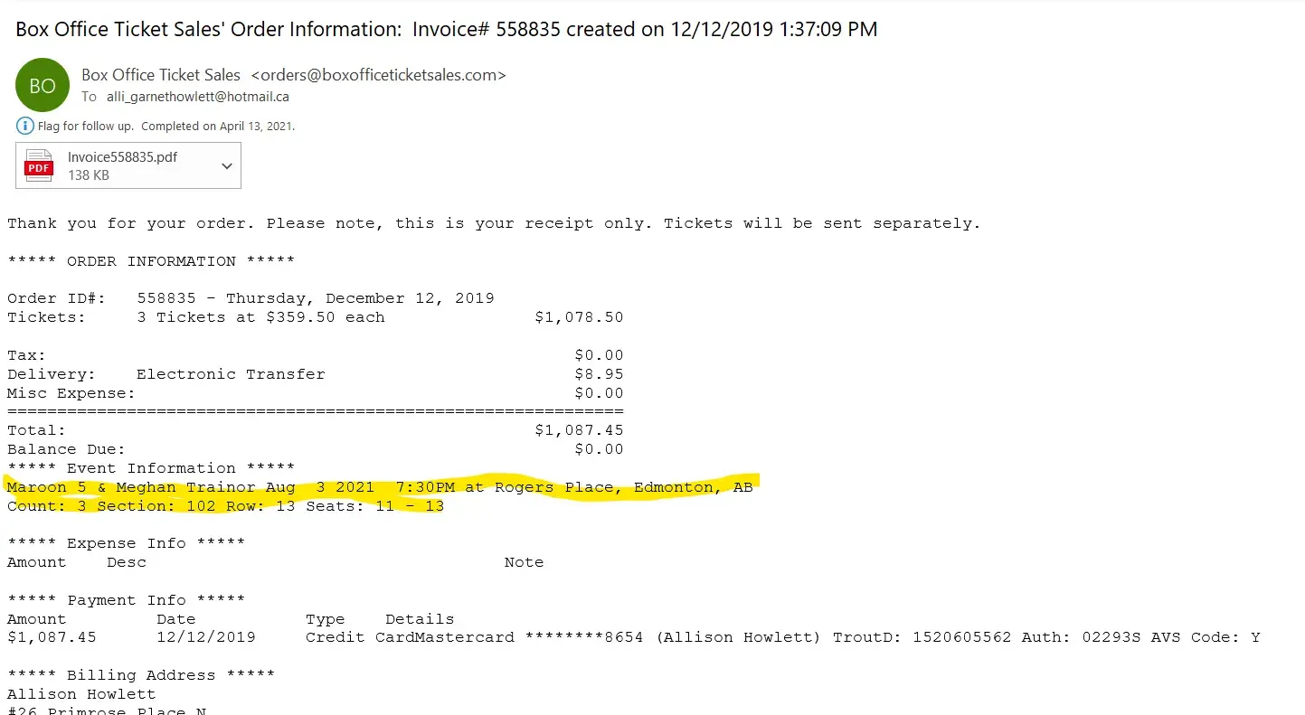 I purchased 3 tickets on dec 12, 2019 for a maroon 5 concert in edmonton, ab - canada on aug 12, 2020. Due to covid, the concert was rescheduled to aug 3, 2021 but then the concert was finally cancelled. According to box office ticket sales policy, a full refund will be issued if a concert is cancelled. All we got offered is a voucher for 110% of the value and it's only good for 1 year. We want our full refund, as per box office ticket sales policy.