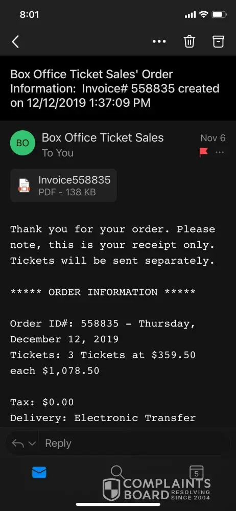 Well we have already filed a complaint & our credit card co is going after them! Enough of the lies & games Box Office Tickets, , you did this to yourself, , I will write a review on every site I can!