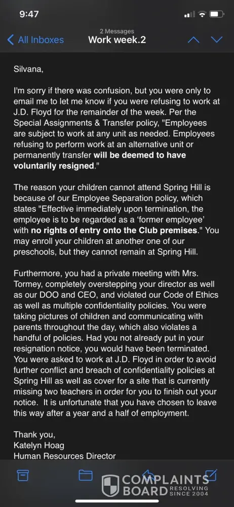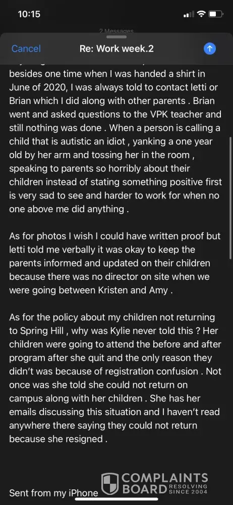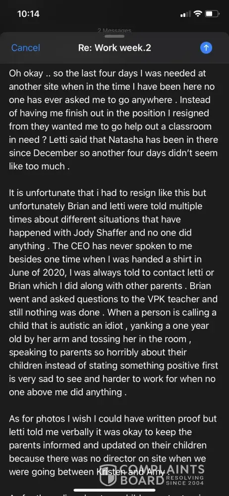 I worked for BGC for a little over a year and a half, January 2022 would have made two years. This coming school year a director was hired that was abusive to the children, rude to parents, scared the older children etc. She yanked a one year old from my classroom by her arm and threw her to the ground, wanted to send another child home with a "temp" and he did not have one, called a boy with autism an idiot for crying his first day in a VPK structured class but he is only 3 years old with an IEP so he is apart of that inclusion classroom. A few more incidents that were very sad and many of those incidents were reported by both me as a staff and by the parents themselves. Nothing was done after 3 weeks of this and I had already handed in my two weeks. I decided to go to the principal of the school since we are in the back portable and no one above me was doing anything about this. The principal asked that the CEO to remove this director immediately or she would not need BGC in her school ever again. Parents even had a meeting with the CEO about the situation and having the director removed as well. The CEO and HR were very upset about this and took it out on me because of their actions, them not doing something about it after multiple complaints was very sad. They wanted to send me to another site my last four days to "avoid any more conflict" which meant they wanted me to speak with no one. Also informed me that when an employee resigns from a site they are no longer allowed on the premises and that includes their children... No other employee was ever told this and I had their emails to prove it . I ended up quitting 4 days earlier than my two weeks and I emailed HR and had interactions that were not okay and that lead to my son being kicked out of the preschool he was attending because of "conflict of interest with parent". I left 8/30/2021 and on 8/31/2021 my coworker that complain early august was asked to finally write up an official report about the situation which was a little strange and a little late to do. It was all very unfortunate and I would honestly not recommend any parent to go to their preschools ever again. The CEO was a new one and supposed to be good but yet she has not done much good for the employees and children personally. I was raised to $11.76 an hour and new co workers that weren't doing anything, being lazy, trying to have the babies sleep all day etc are getting paid 30 cents less than me . They should actually train and observe the people the bring in to care for babies and be considerate of these parents that trust these facilities to take care of their children. I have attached the screen shots of the emails that were sent between HR and I . Im not looking for much of an outcome from all this, I just want them to do better and put more effort into the company and making it successful . There are many complaints and it is sad that for what BGC stands for it all seems to be a lie at the end .