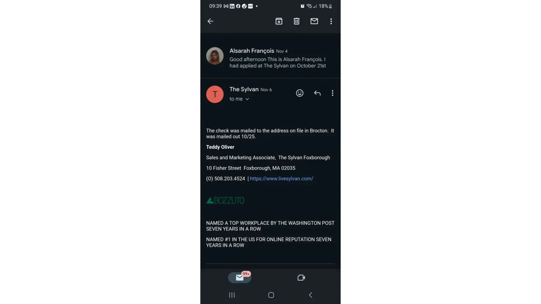 I had applied to The Sylvan at Foxborough and was denied. The denial was within 72 hours so I was still eligible to receive a refund of $500 for my deposit. I called the management office and they said it was mailed on the 25th of October. I have never received the check. I went to the post office amd they said they never saw the check either and o talk to...