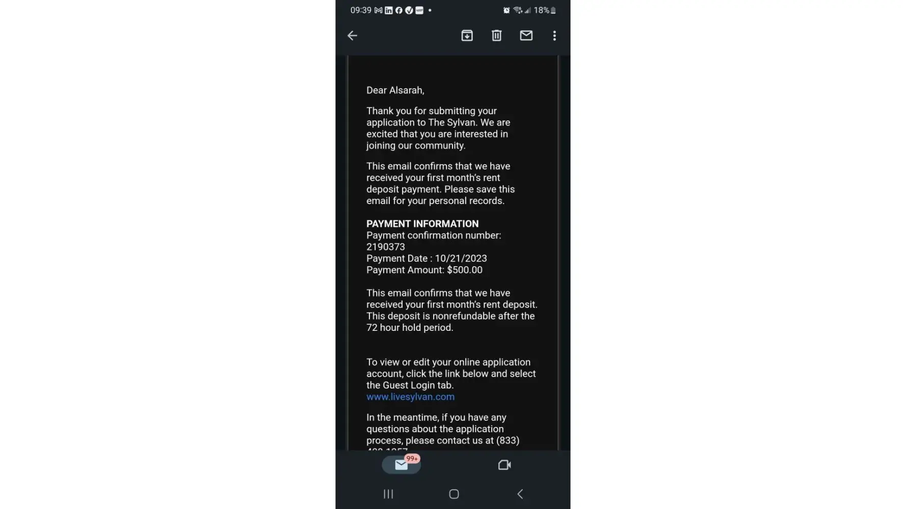 I contacted, applied, was approved for an apartment at *** Chicago on October 5, in which I paid a $500 deposit and a $50 administrative