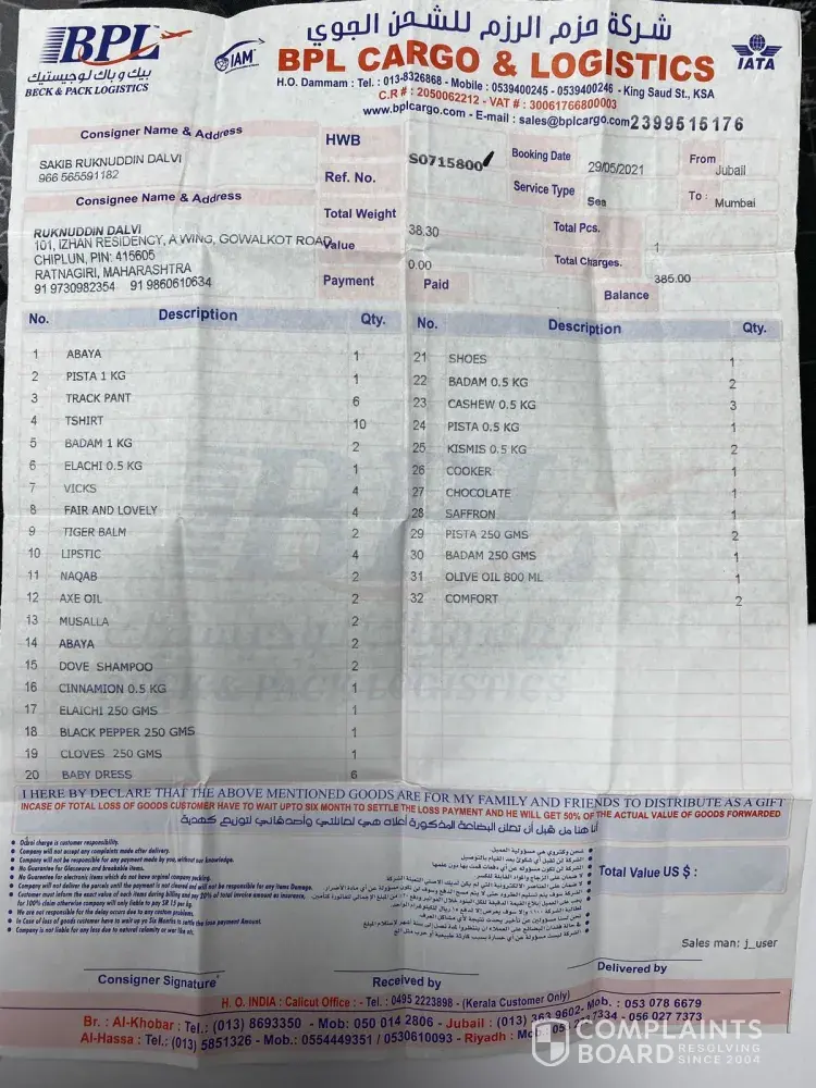 Worst service of bpl cargo...my cargo tracking number is S0612905...it was send from AL.khobar Saudi Arabia on 1st June 2021 and now it's 5 months 12 days and still the status is same...