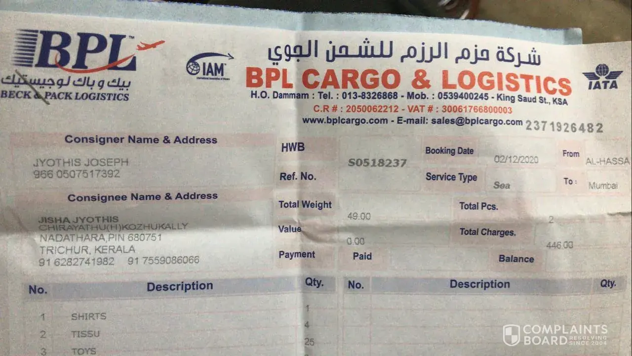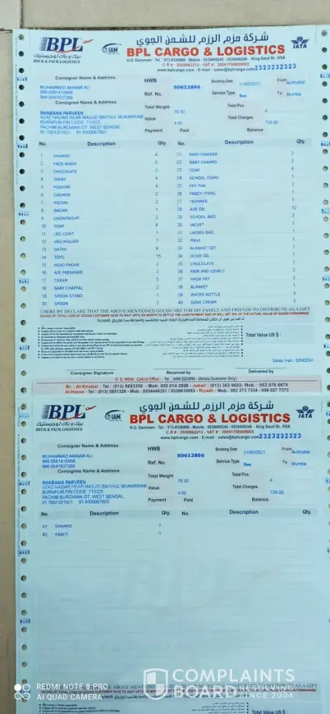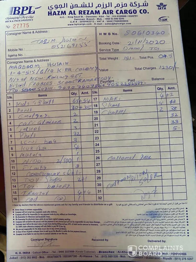 I am speaking from saudi arab Damam Al Hasa. We sent some goods from BPL. Cargo on 5 December 2020. It has been 4 months so far. So far, some things have not been found at our house, so we want you to help ðŸ™ðŸ™ðŸ™