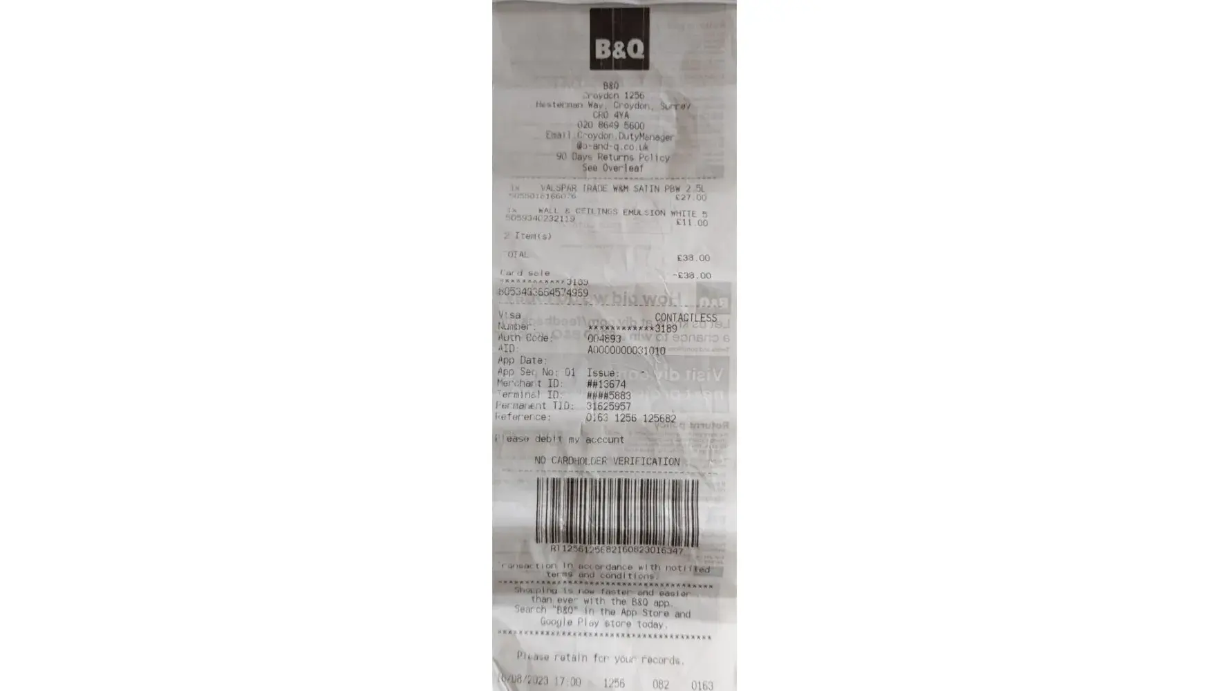 Sunday 20 August I went to B&Q Croydon to return a tin of white paint - I ended up leaving without being served, as there was only 1 till open where the refund could be transacted - and while I was waiting, it was left unattended for a long time
