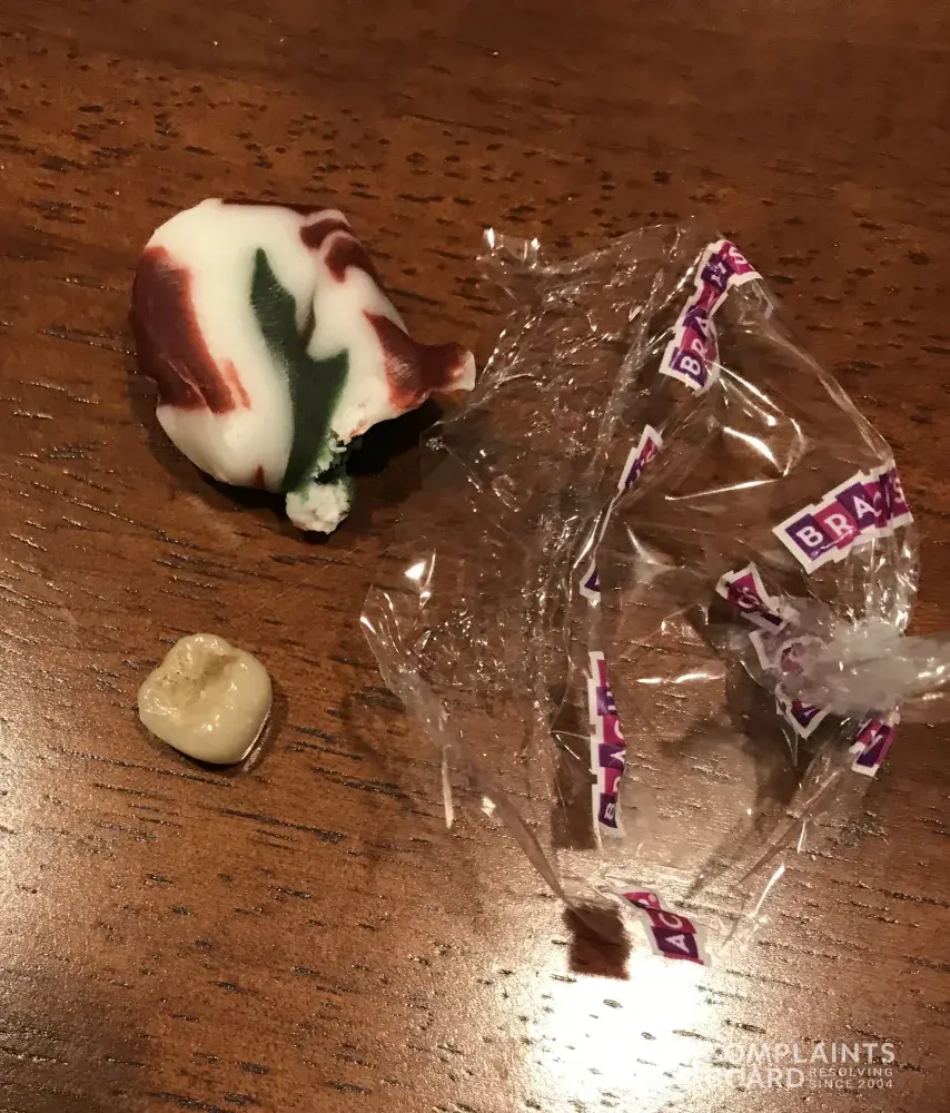 My husband ate one of these candies that were purchased recently. While chewing it he bit on something very hard. He spit it out the washed the nougat off and it was a molar cap. We immediately inspected his teeth, but it was not his tooth. It was in the candy. He was very distressed as was I due to the possibility of transmitted diseases and the chance of injury, besides totally grossed out. Beware of this product. I would like an explanation as to how a tooth can be imbedded in their candy