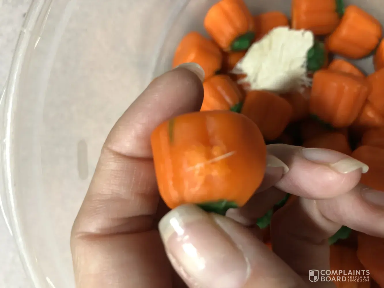 I purchased a bag of pumpkins and when I poured it into the bowl to make a fall trail mix a big chunk of something came out. It looks like some kind of wall or fiber board painted white. It is larger than a fifty cent piece. I was shocked and disgusted. I have attached photos. I thought it best to notify you for safety reasons. I included information from the bag. What could this be? I would like a reimbursement at the very least. Thank you.