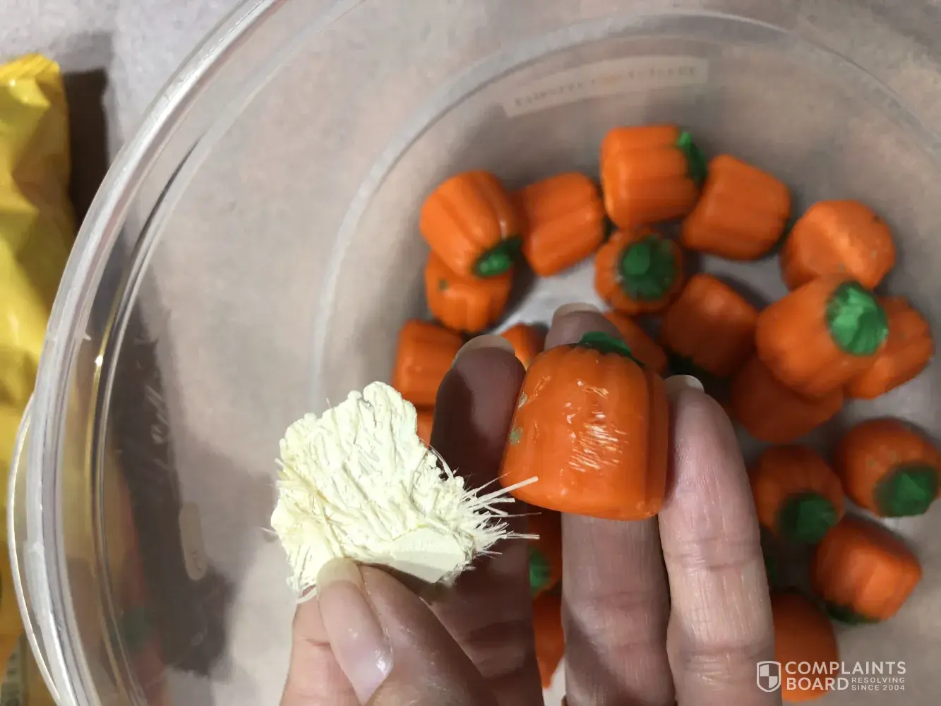 I brought a sack of pumpkins, which are one of favorite candies next to candy corn. Half way though the sack, the bottom half of the sack was all stuck together and they felt sticky.