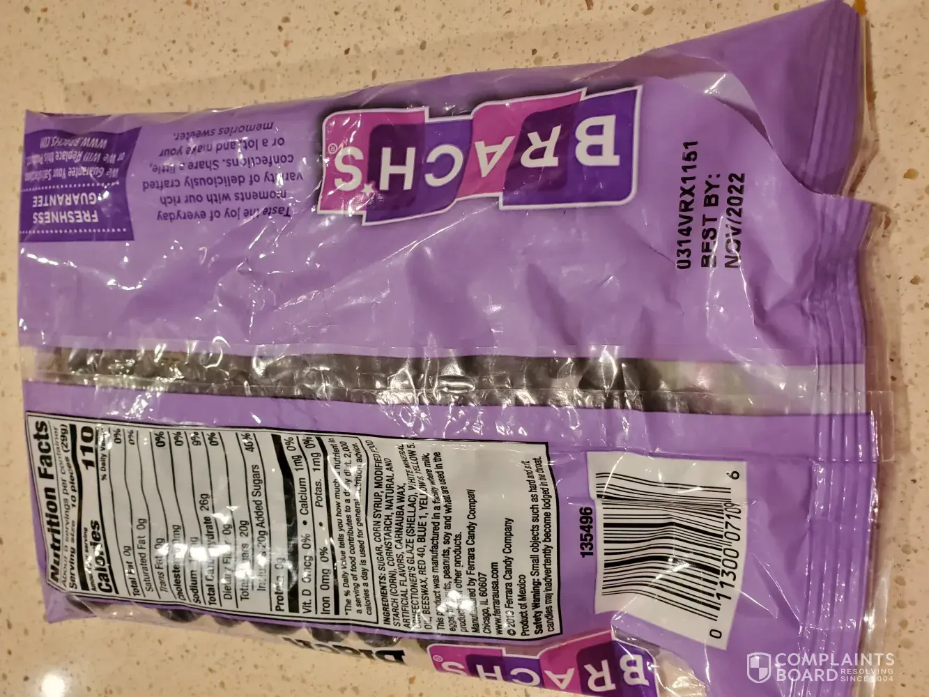 1/3/2021 Marlayn Taylor [protected]@yahoo.com I've been buying your candy & have a complaint. The last bag of peppermints had at least 30-40 mints that had no peppermint in them at all, they were pure sugar. I love peppermint & it helps me with my stomach. #0280VRX2061 best by 10/4/22. I was very disappointed in this problem. I could've bought store brand but went with Brach's thinking it was a better product. The UPC #[protected]. I since purchased your Big Bag 315 pieces. I hope there isn't the same problem with this bag. I don't want to be forced to buy another brand of mints. Thank you, Mrs. M. Taylor