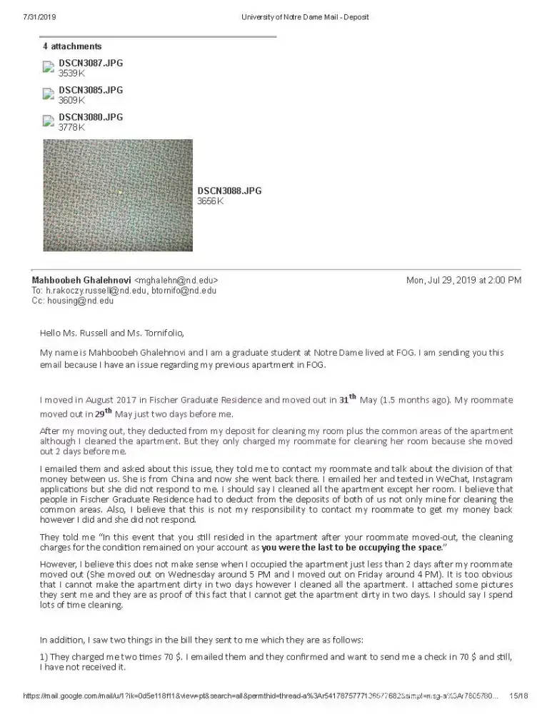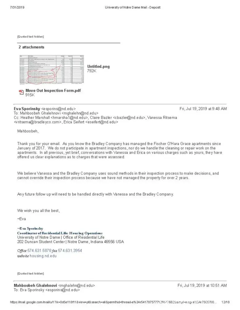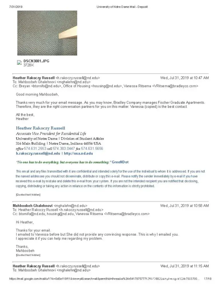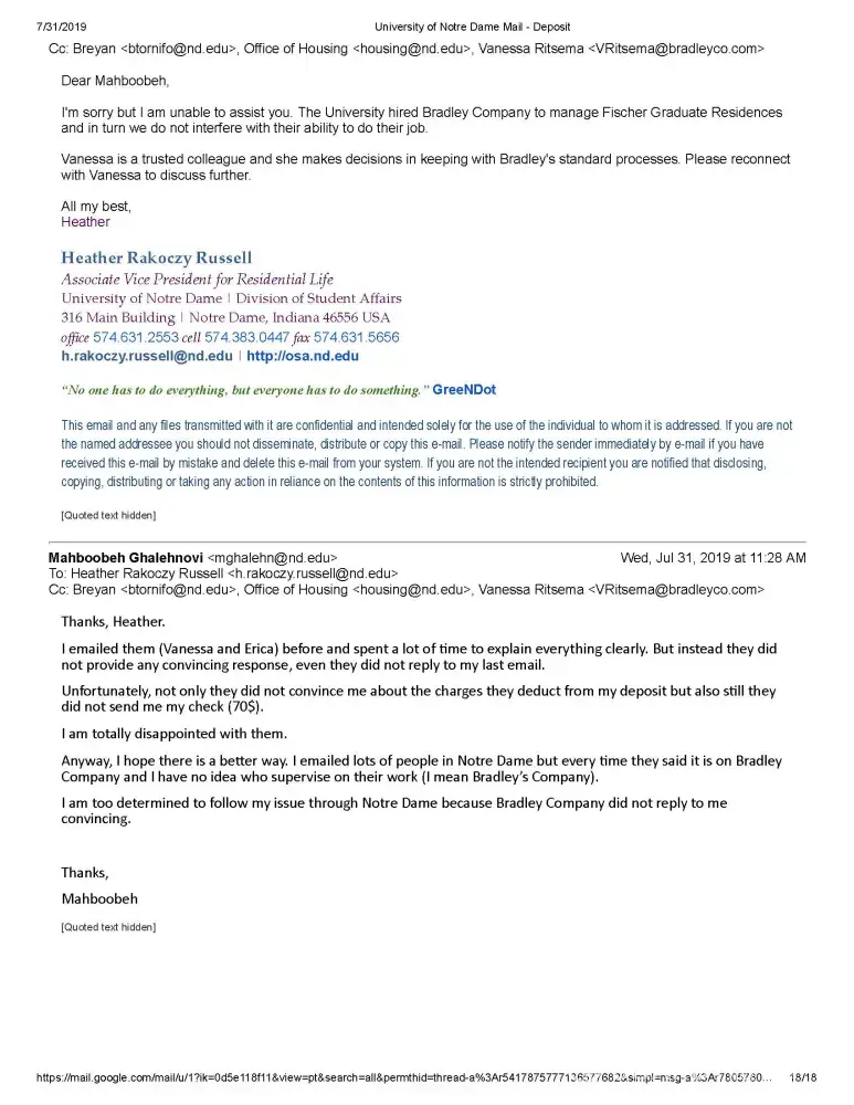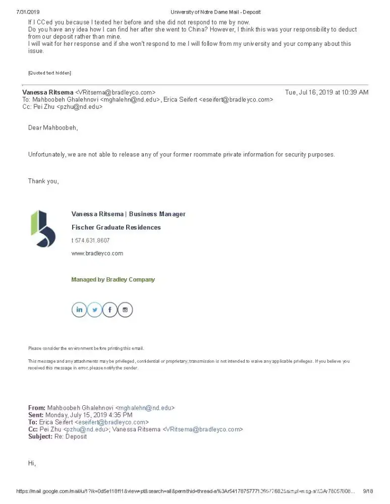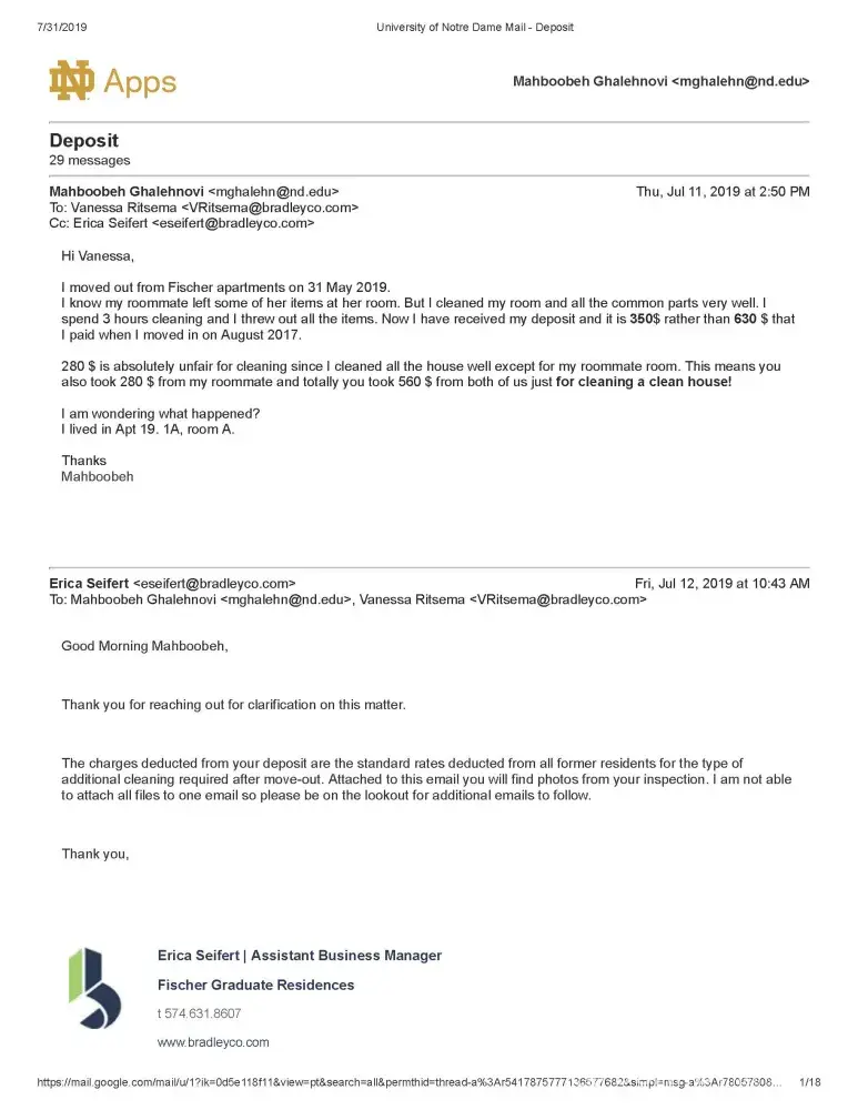 My name is Mahboobeh Ghalehnovi and I am a graduate student at University of Notre Dame lived at FOG. I am sending you this email because I have an issue regarding my previous apartment in FOG (Fischer graduate Residence). Bradley Company runs FOG.
