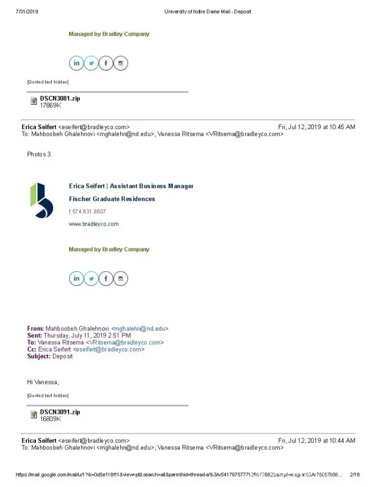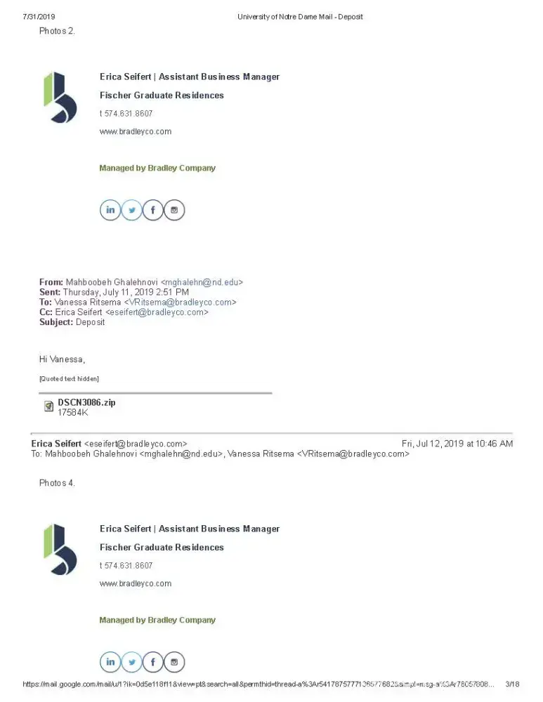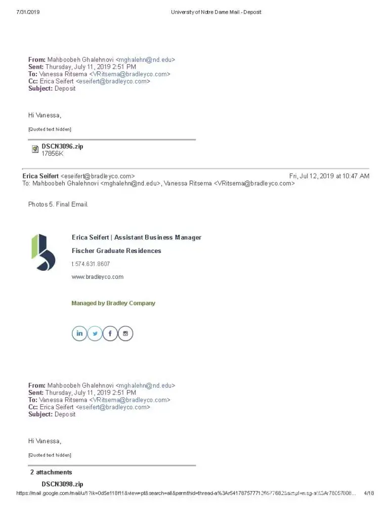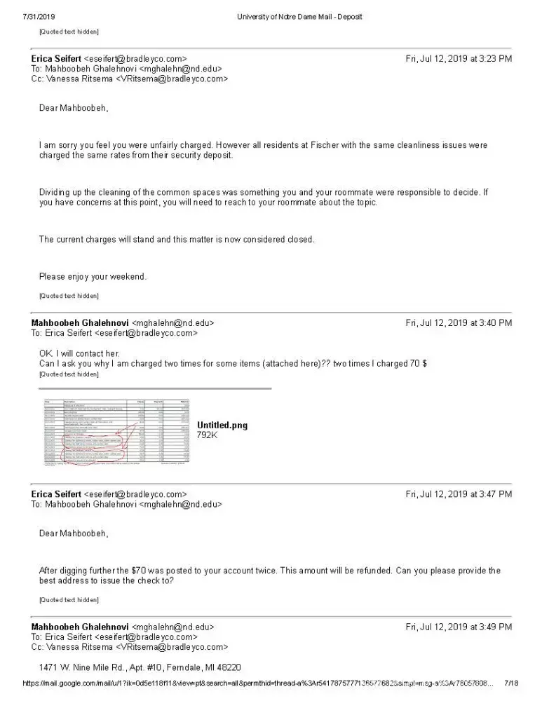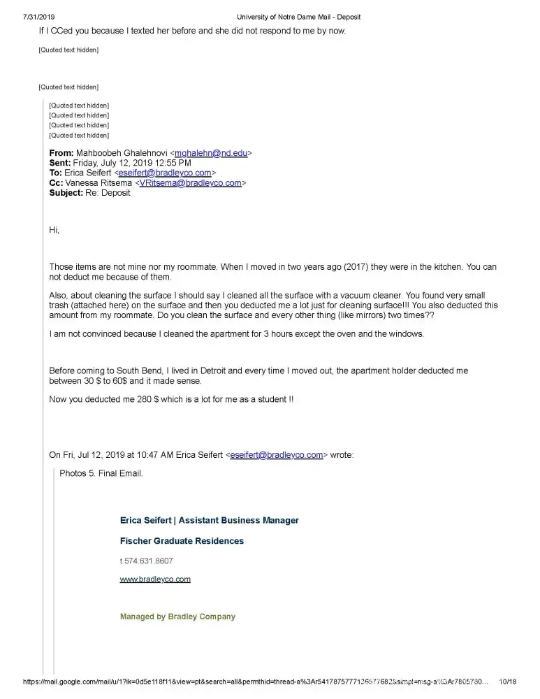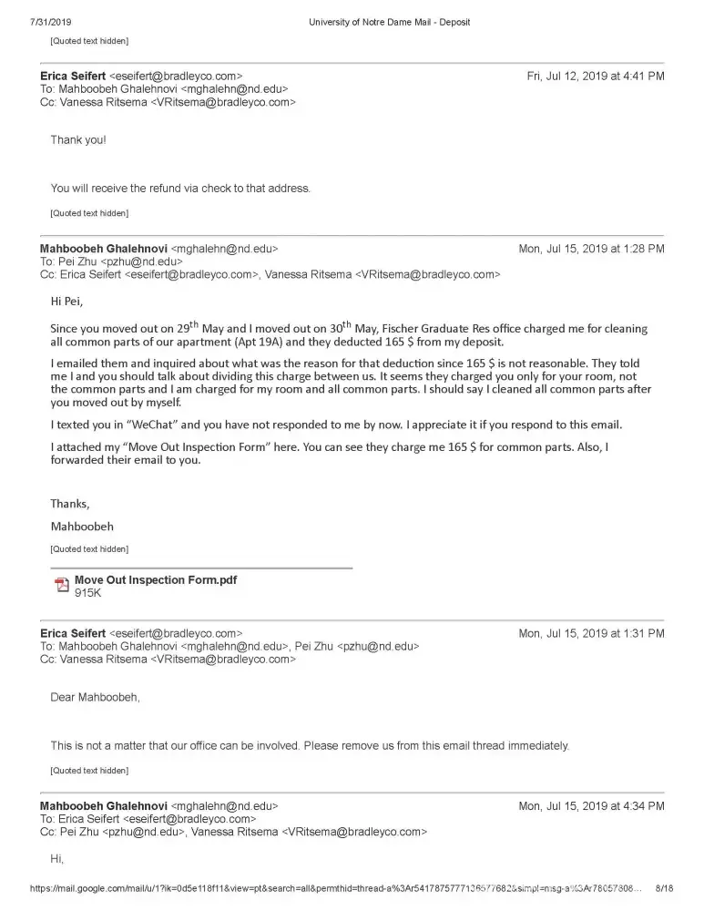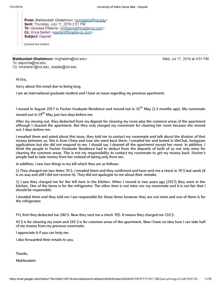 My name is Mahboobeh Ghalehnovi and I am a graduate student at University of Notre Dame lived at FOG. I am sending you this email because I have an issue regarding my previous apartment in FOG (Fischer graduate Residence). Bradley Company runs FOG.