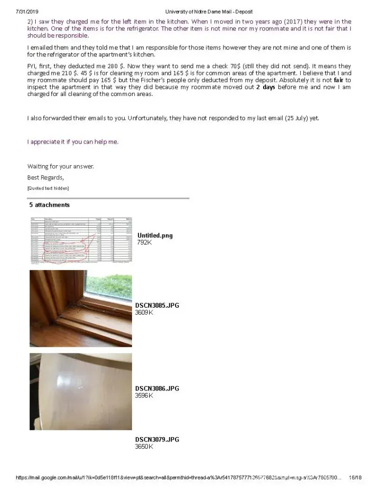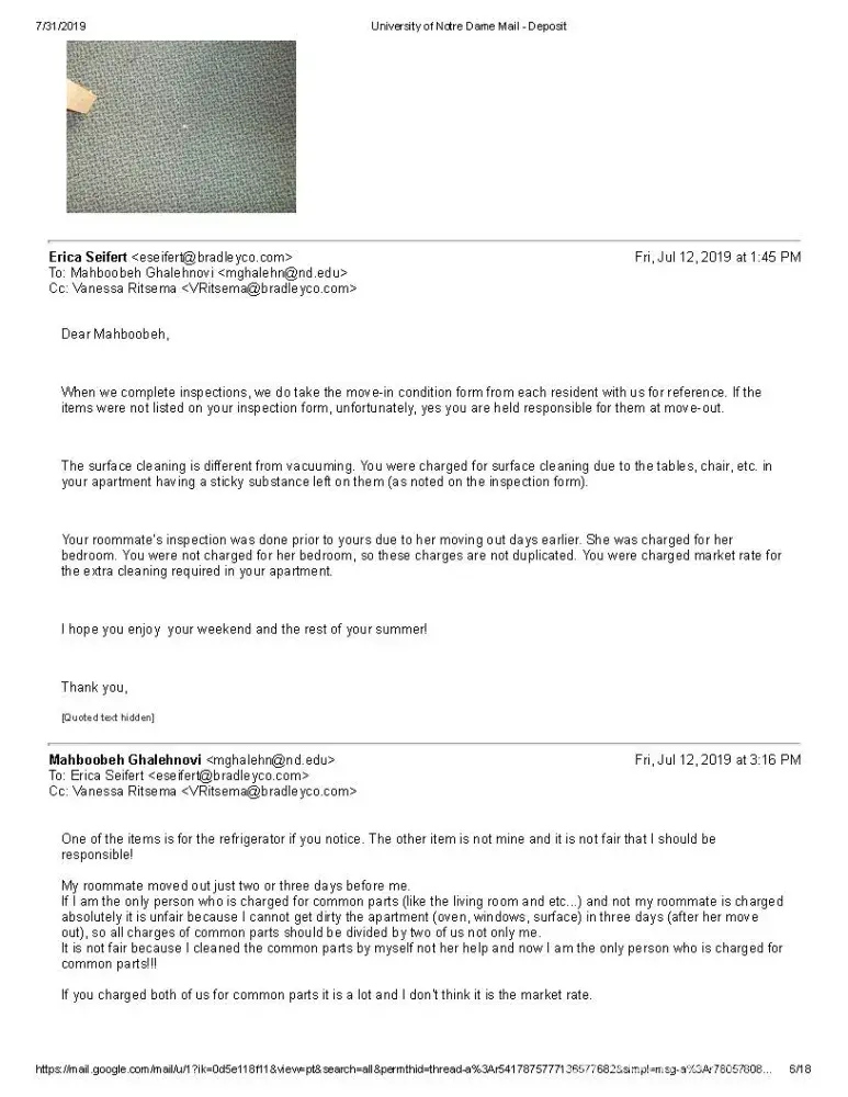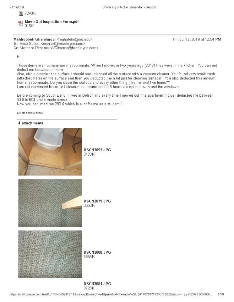 However, I believe this does not make sense when I occupied the apartment just less than 2 days after my roommate moved out (She moved out on Wednesday around 5 PM and I moved out on Friday around 4 PM). It is too obvious that I cannot make the apartment dirty in two days however I cleaned all the apartment. I attached some pictures they sent me and they are as proof of this fact that I cannot get the apartment dirty in two days. I should say I spend lots of time cleaning.