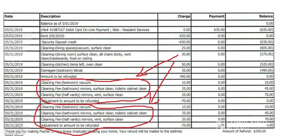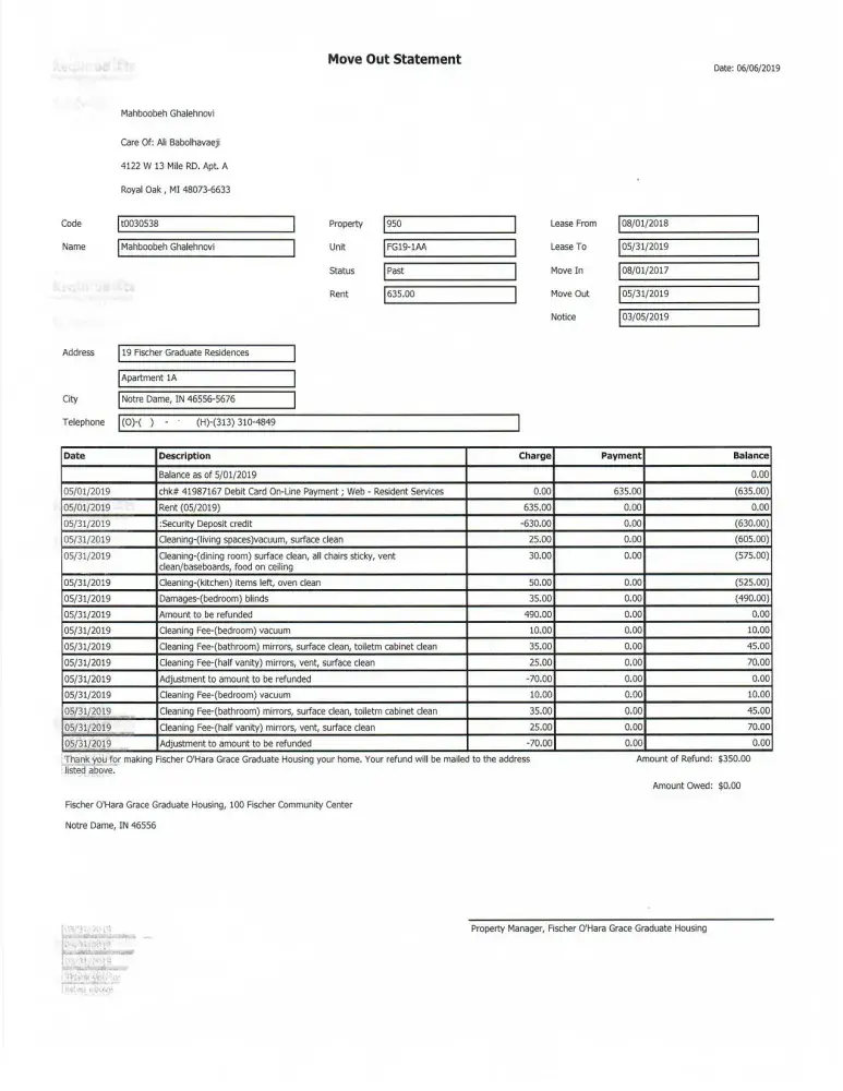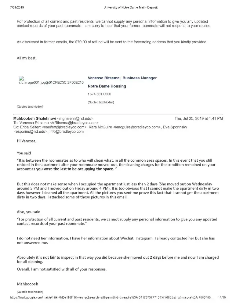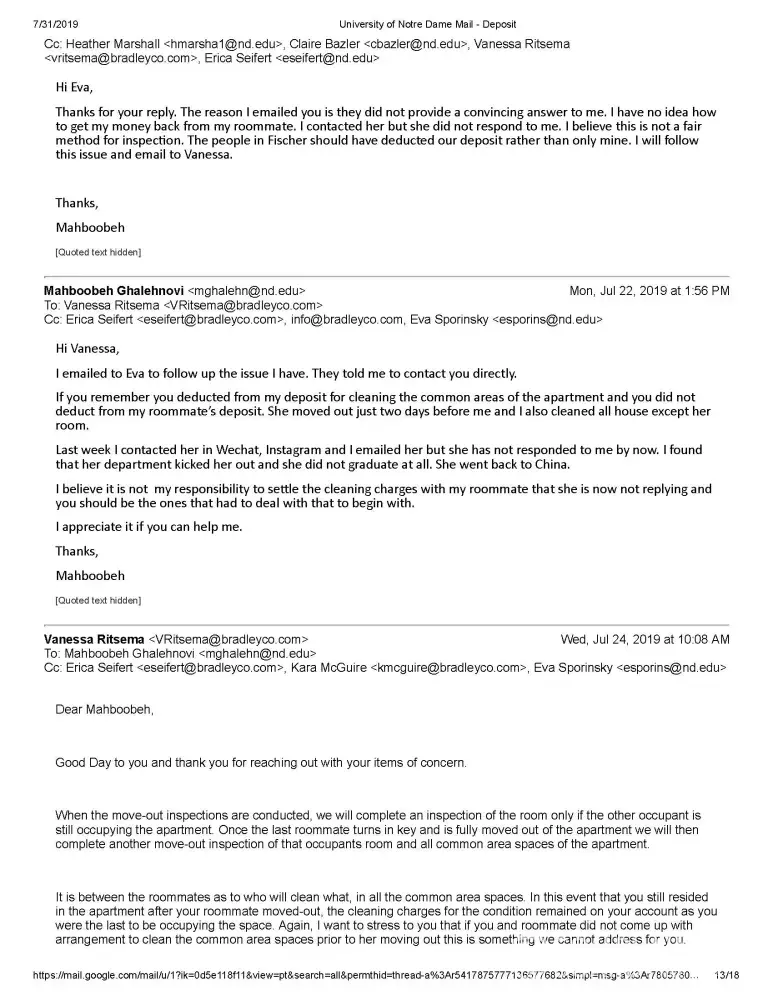 I emailed them (Vanessa and Erica) and asked about this issue, they told me to contact my roommate and talk about the division of that money between us. She is from China and now she went back there. I emailed her and texted in WeChat, Instagram applications but she did not respond to me. I should say I cleaned all the apartment except her room. I believe that people in Fischer Graduate Residence had to deduct from the deposits of both of us not only mine for cleaning the common areas. Also, I believe that this is not my responsibility to contact my roommate to get my money back however I did and she did not respond.