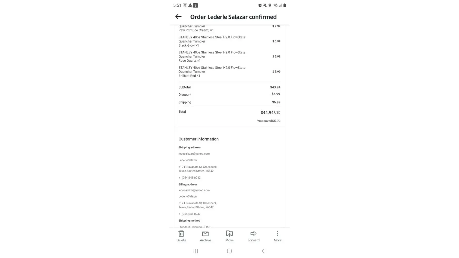 I bought 5 Stanley cups and I have never received them. They said they would resend them, but I never got them. I sent my receipt with pictures of my address and I still have received anything. Now they have gone silent.