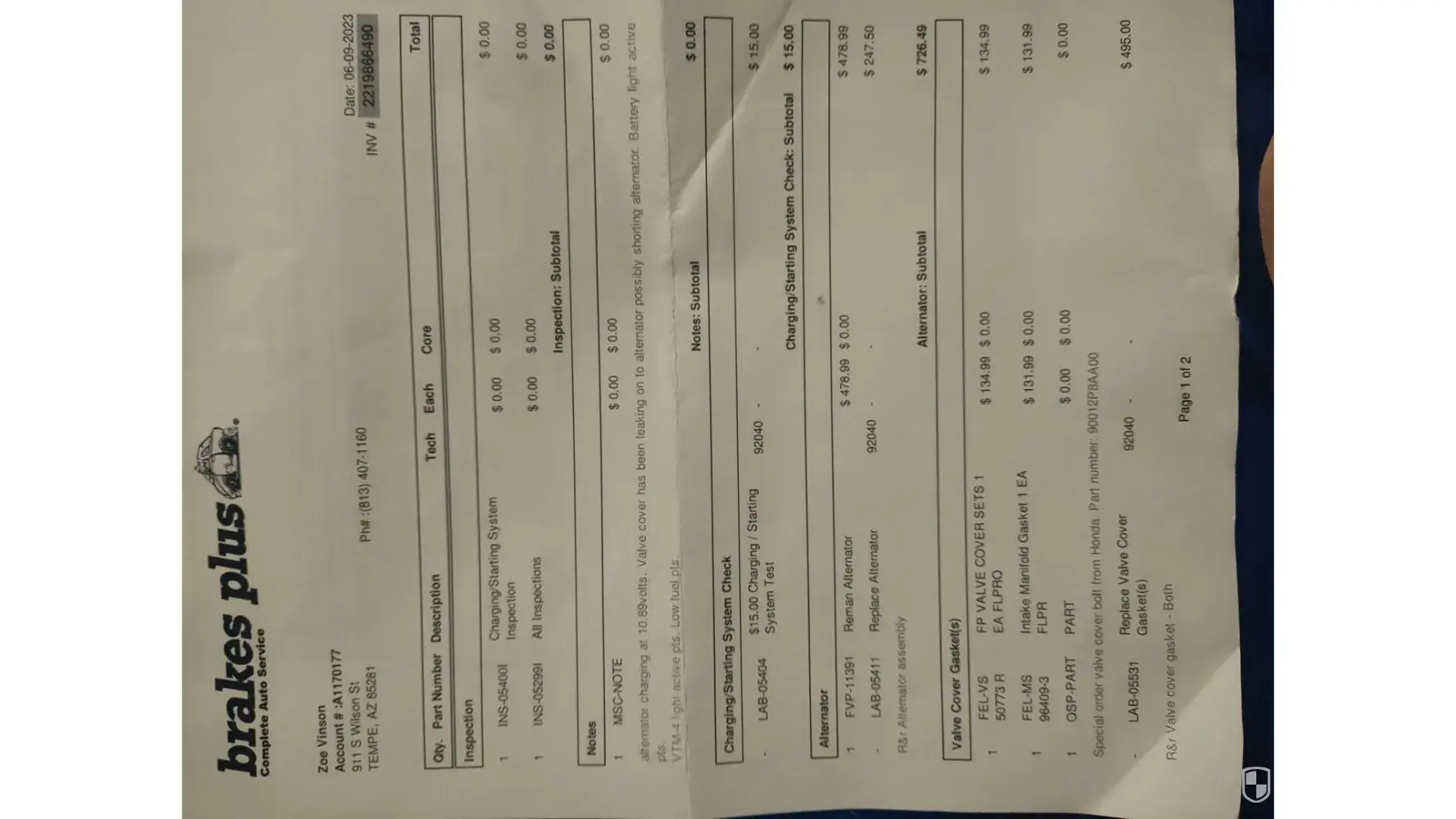 June 9 2023 Brakes Plus in Tempe, AZ replaced my alternator woth a remanufactured alternator after the intake manifold gasket leaked onto the old one. They replaced the intake manifold gasket and few things to address the leak. We were never given an option between remanufactured and new for the alternator. We paid $1450 for the total of the work. The remanned alternator is not holding a charge after 4 months.
