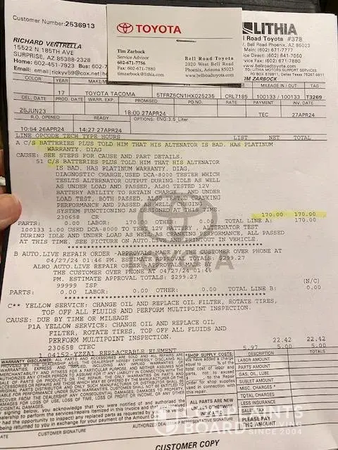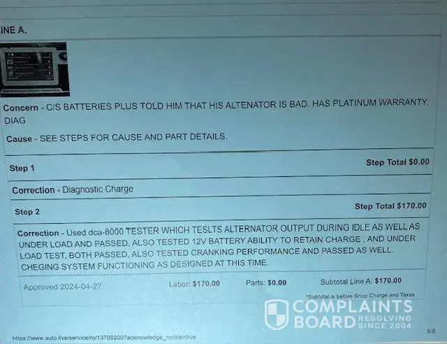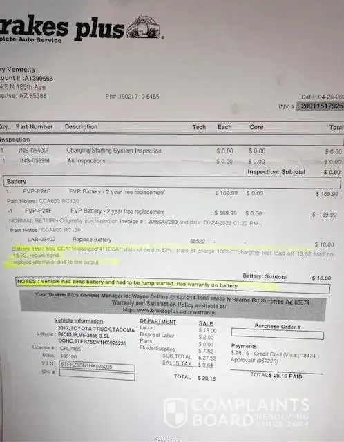 Our Toyota Tacoma truck's battery needed to be jumpstarted early on 4/26/24 morning; it was under warranty with Brakes Plus. So, I brought the running Tacoma in to get a new battery for my husband; he had to go to work. They told me it needed a new alternator. I contacted my husband, who called Toyota and was confirmed that it was covered under our extended...