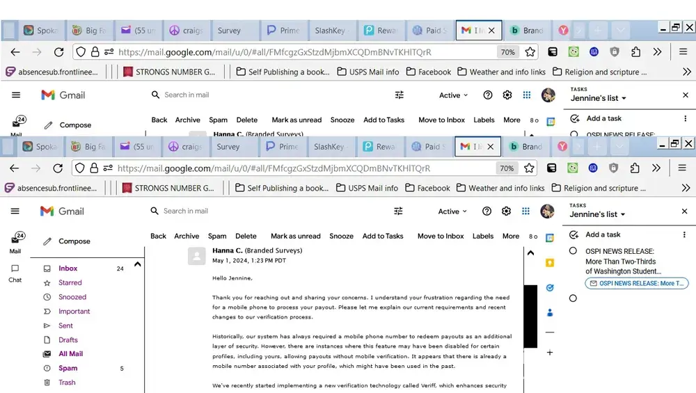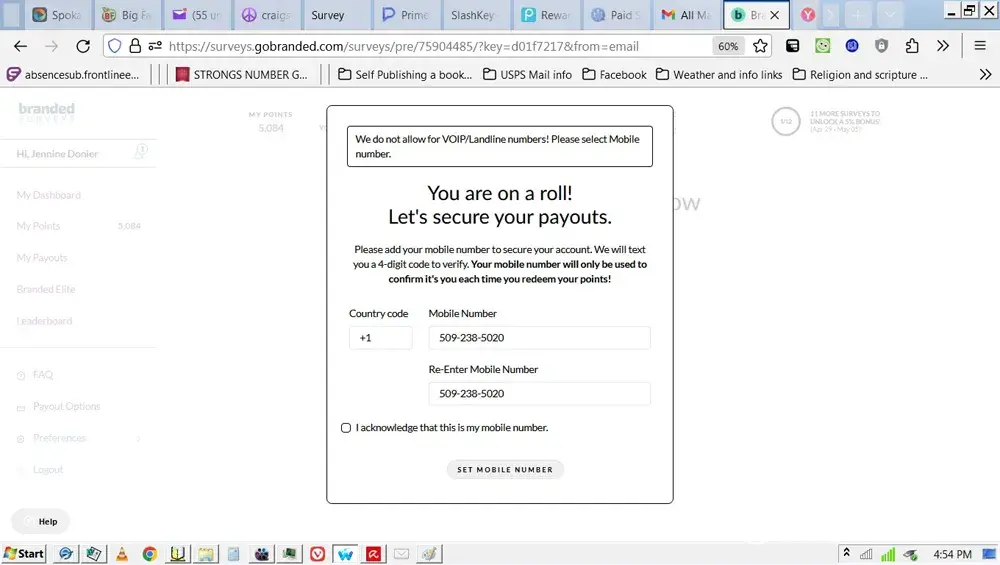 I joined Branded surveys via an invitation about 4-5 years ago and never saw anywhere we had to use a cell/mobile phone. I do not have or use a :Smartphone" I live in rural mountains of Eastern Washington 25 miles from Spokane and in a wildlife refuge area which has a moratorium due to the EPA against putting in any Cell towers in the area. So over 5200 residents use landlines and only use cell phones in town. We have centurylink landlines. I have a basic cell phone not one with all the whistles and bells on it for use in town for emergencies. No camera no internet etc. It is old but works I am 74 and not into or want to have a smartphone they just confuse me and I do not text or anything/ I take surveys online at home to earn a little extra income a month to supplement my social security check so I can help grandkids and buy gifts. I have twice before asked for payment from Branded Surveys and neither time was asked for a code or cellphone number. Now suddenly when I needed money to help a granddaughter with gas money as she is planning a short trip They demanded a code and cellphone. I don't have nor use. They have got nasty and blocked me from access to my survey profile and account unless I give them a cellphone number I do not have nor use. I have a landline other surveys, Facebook etc allows me to have a landline and sends me an email with a code to put in or calls my landline with a code Branded Surveys needs to do the same. YES they KNOW I am 74 it says so on surveys at the bottom of the page They refuse to pay me $50.65 I have earned the past 4 months. I plan to notify the BBB the FTC and both California and Washington State Attorney General consumer affairs this abuse and illegal. I just want my money and then they can delete my account don't need snotty rude little brats acting like they are superior and nasty. Done once I get my money. I will also notify everyone on my social media accounts, Twitter, Pintrest, MeWe, Facebook Linkedn and Nextdoor. Angry old lady being cheated and bullied. Jennine Donier HELP See screenshots. UGH IT WON'T LET ME ADD 3 more screenshots proving my case UGH UGH UGH Keeps saying error these are important