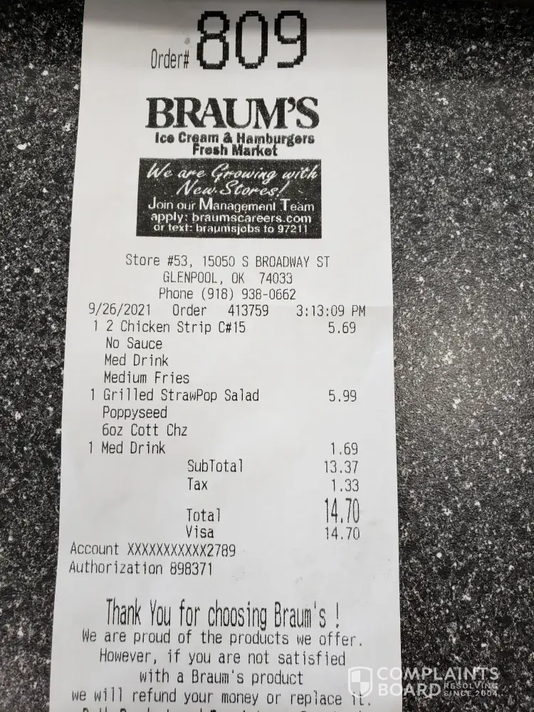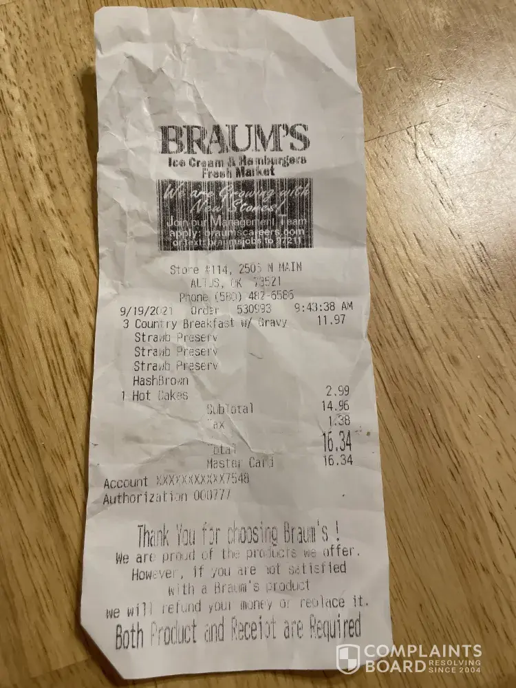 Braum's earns a 1.2-star rating from 4 reviews and 106 complaints, showing that the majority of ice cream and dairy enthusiasts are dissatisfied with products and service.