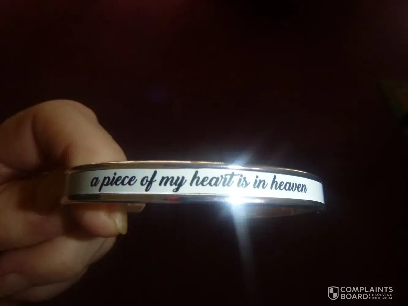 Received my bracelet today — omg, it is just a piece of cheap metal with a sticker on it, with the saying "a piece of my heart is in heaven". A sticker on the bracelet, no engraving! Paid a total of $24.98, which included shipping, for this piece of junk. I was to give this to my niece after the death of her father and brother last year... I am embarrassed to do so now! Don't buy anything from this company!