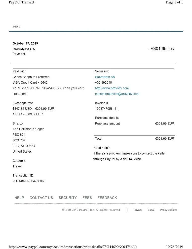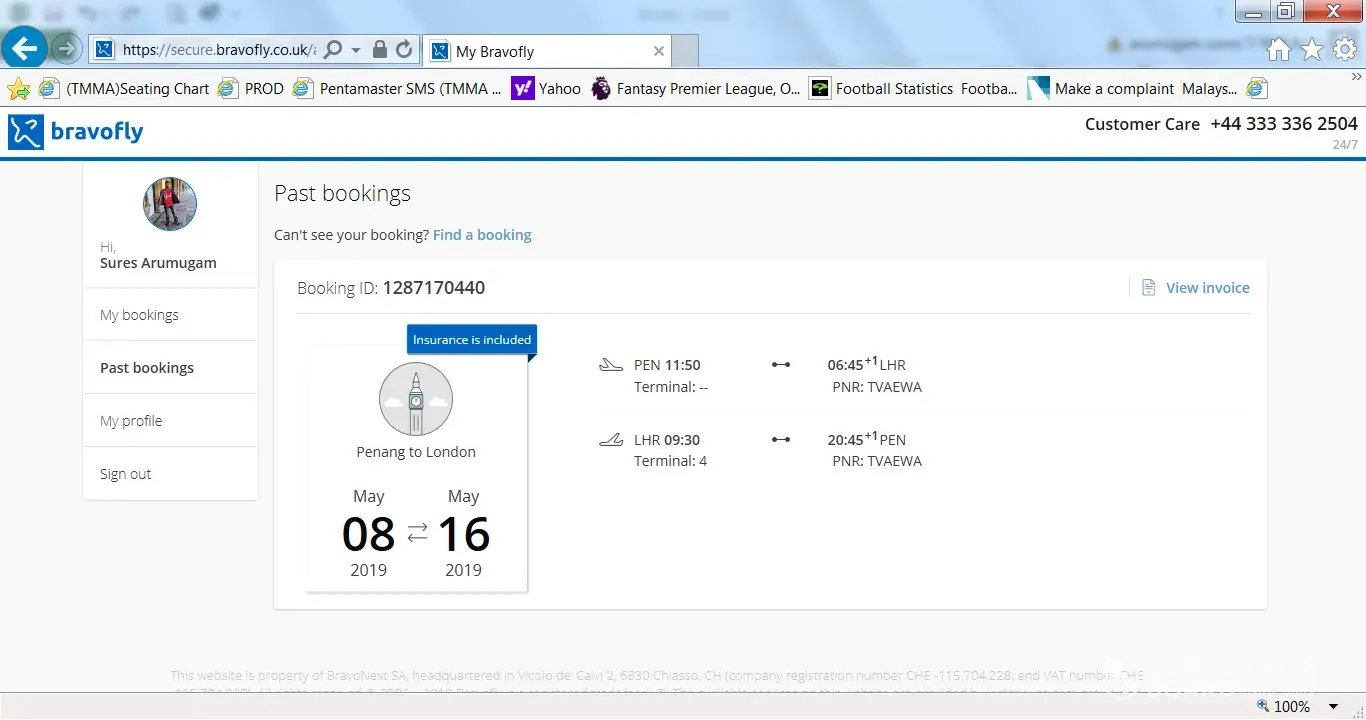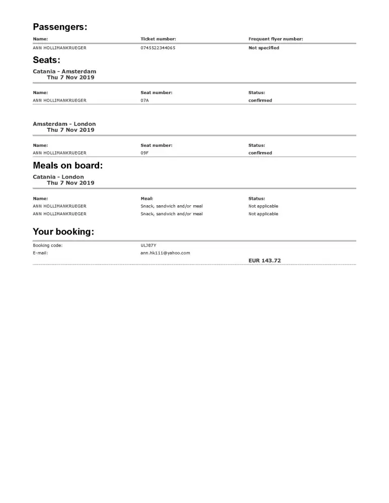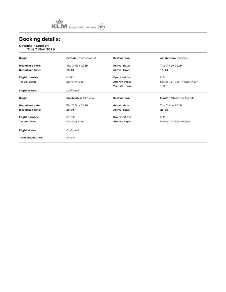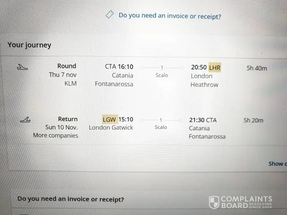 In checking the flight details for a trip to London, I see that there has been an error in my booking with Bravofly. I booked and paid for a roundtrip flight to London from Catania, Sicily. Paypal documentation verifies the amount paid for a roundtrip ticket. However, the KLM airline shows only a one-way reservation and payment documentation of only half the Paypal amount. This was a roundtrip flight! The returning flight was on British Airways/Air Malta on Sunday, Nov. 11, 2019 from Gatwick to Catania at 3:15 pm.