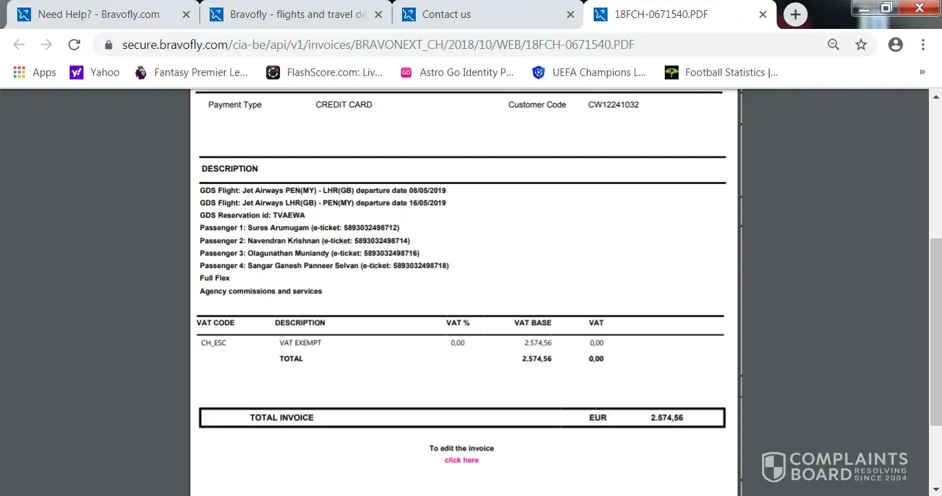 And you replied with a quotation for the change requested, modified date now is December 26, 2012! Why is it 2012? so I concluded there must be a system error on your part. Much more you are charging me of 1, 247.99 Euro. I did not confirm the quotation, instead I emailed Bravofly to make a complaint at 9:05pm same date Oct. 27, 2019.