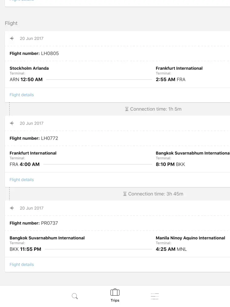 On May 17, we (party of three) missed our flight from Manila to Stockholm due to faulty informtion provided by Bravofly. I never received the usual booking details by mail so I relied on my printed online information provided by the Bravofly app. I am attaching this information. All flight data here is off by 6 hours causing us to arrive at the Manila Airport too late for our first leg to Bangkok. There were also no other fligths to Bangkok available to catch our next leg in time. The information has since been corrected but due to login problems I never had access to it.
