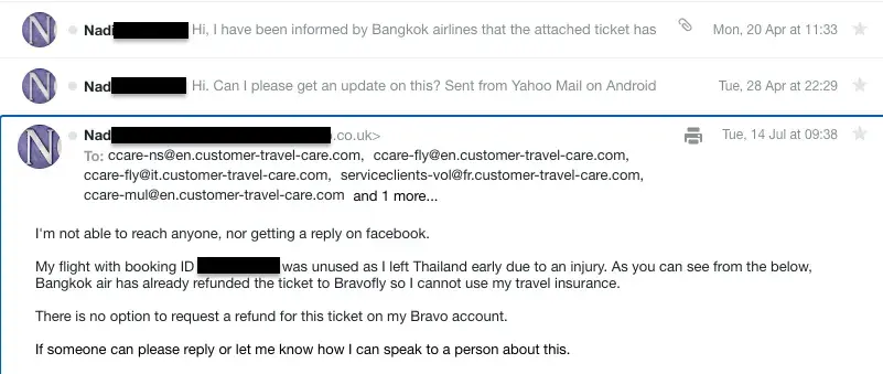 I have an unused ticket (booking ID [protected]) with Bravofly from January due to injury and leaving Thailand early. Since March, I have sent 3 emails; 4 messages on Facebook; and phoned 2 different phone numbers that I could find online - no reply... it is IMPOSSIBLE to contact them. Bangkok airline confirmed that the flight was already refunded to Bravofly, so there is no way for me to claim via my travel insurance.