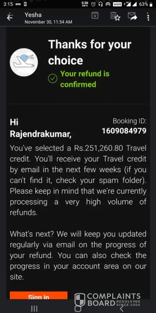 Desired outcome: I want my refund. Peace of mind knowing that my hard earned money can still be used for another holiday.
