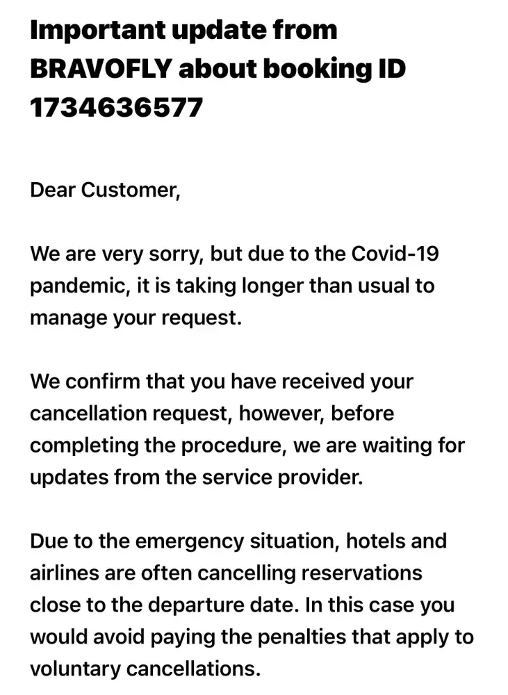 It was booked through Bravofly but due to COVID-19 the flight was canceled so we asked for a refund.