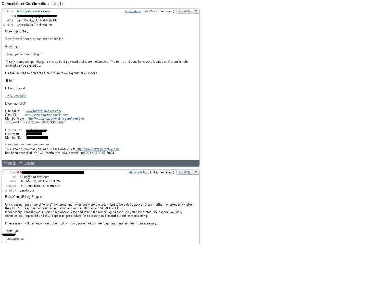 As usual9for me) when considering a purchase that offers different payment plans - I chose the most efficient plan which was the 12-mo payment up front rather than the more expensive monthly fee. Upon completing a purchase through my cell phone for my cell phone (a mobile access website), I found that the video's due to an unknown reason will not play on my phone and immediately went back to the website and scoured it for more than half an hour attempting to find a means to cancel the account and get a refund. Finally, I had to get to a desktop pc and look up the website in order to email them and request a cancellation and refund. The terms and conditions said it would take no more than 2 days to get a response to any questions. Yet, it took an additional email and 3 days to get a response re my request. Within these responses were a simply stated 'due to terms and conditions you cannot have a refund, but we have gone ahead and canceled your account for you", I immediately shot back a a respectful reply, stating I saw nothing that stated it was non-refundable and was more than willing to come to a mutually beneficial conclusion to the arrangement, to no avail. A different billing agent responded, addressing me with an incorrect name, and stated again, the same as the first agent in an even more brief and terse manner. At this point, I emailed back immediately that I knew *where* they had been and was asking for *a copy* of them, at which point they opted to not even respond. Needing to complete my night at work I called once I got home in order to address the issue.