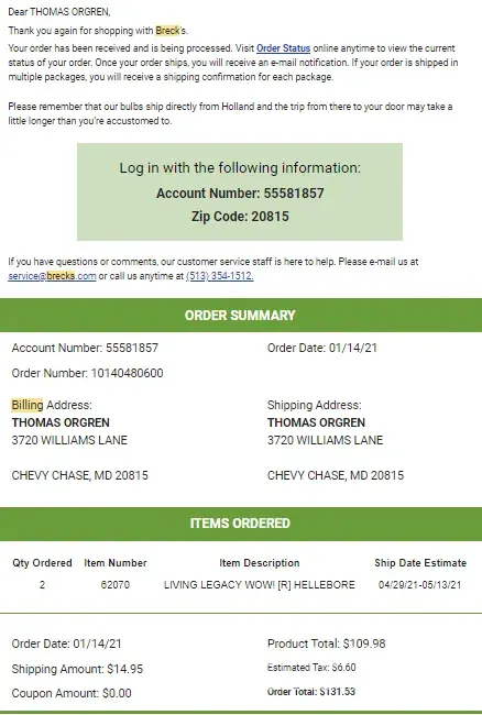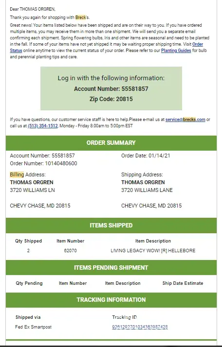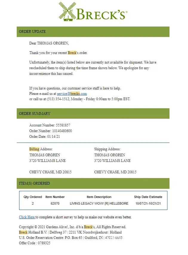 Breck's will take forever to ship, and in the year 2022 are unable to send a bill through email. Placed an order for hellebores based through a paper order form sent to me in a Breck's catalog. The order was received by Breck's on 1/14/21 with estimated ship date of 5/14/21. Received email on 5/20/21 informing me that shipping date was delayed until 10/21/21. Order finally shipped on 9/22/21. Received email correspondence regarding order status but it never indicated any outstanding balance on the account. Breck's claims they sent bill through mail, which I never received as I'd moved away from the address in question by the time they sent it, and they never many any attempt to send any statement electronically. Instead of ever trying to call or email, they passed the account balance on to a debt collector. Will not be spending another cent with Breck's. They're at best misleading - and at worst it's a total scam that will show up long after promised, with all sorts of nasty surprised attached.