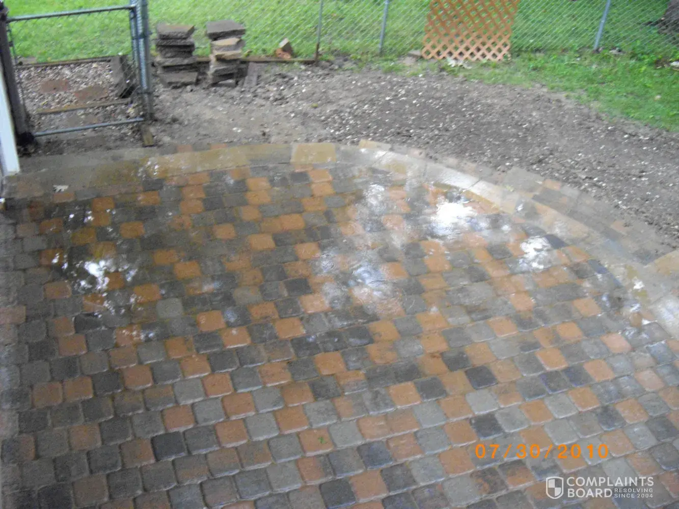 In June 2010, we contracted with Breedlove Landscape Services located in Centralia, Missouri. They were supposed to install a patio alongside the back area of our home. This area takes a lot of rain and it was understood and stated on the contract that “proper drainage” was guaranteed. The area was also supposed to have the correct slope to take the water away from the house. Long story short…the area is not adequately sloped away from house. At the first rain we had an area 7 feet in diameter with 1 inch of standing water. (see picture) Now there are two more places that have sunk. They also have apparently cut out a previously installed drain pipe put in to carry the water away from the house, because it was in their way.