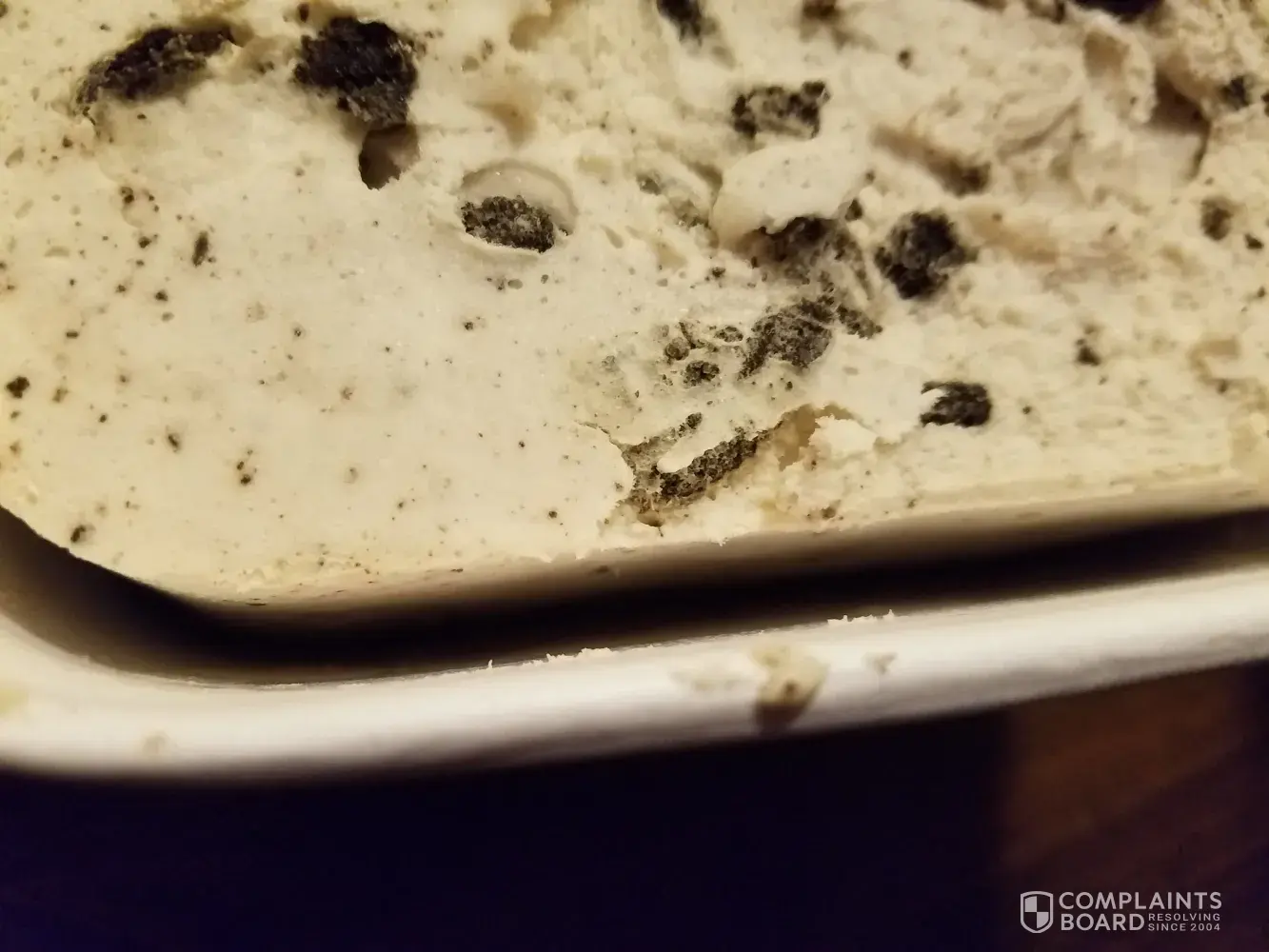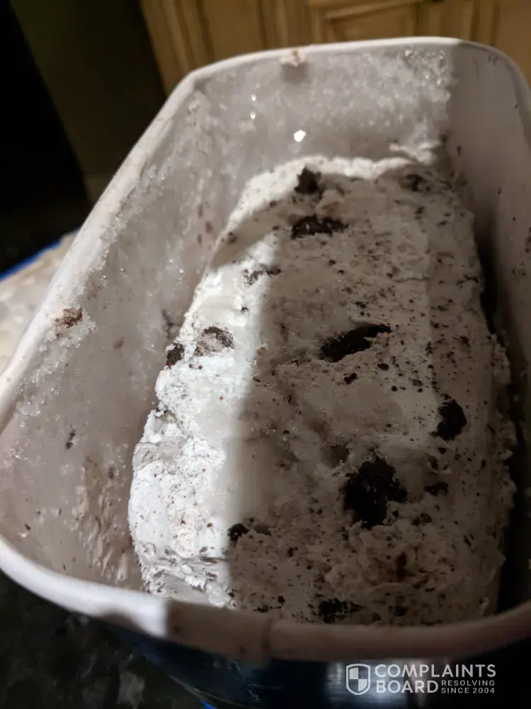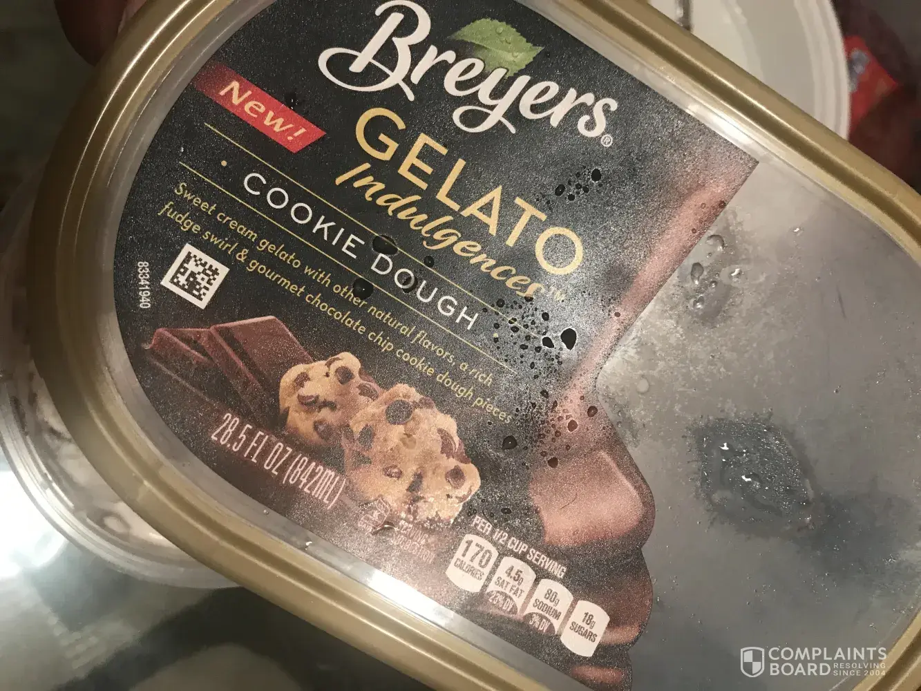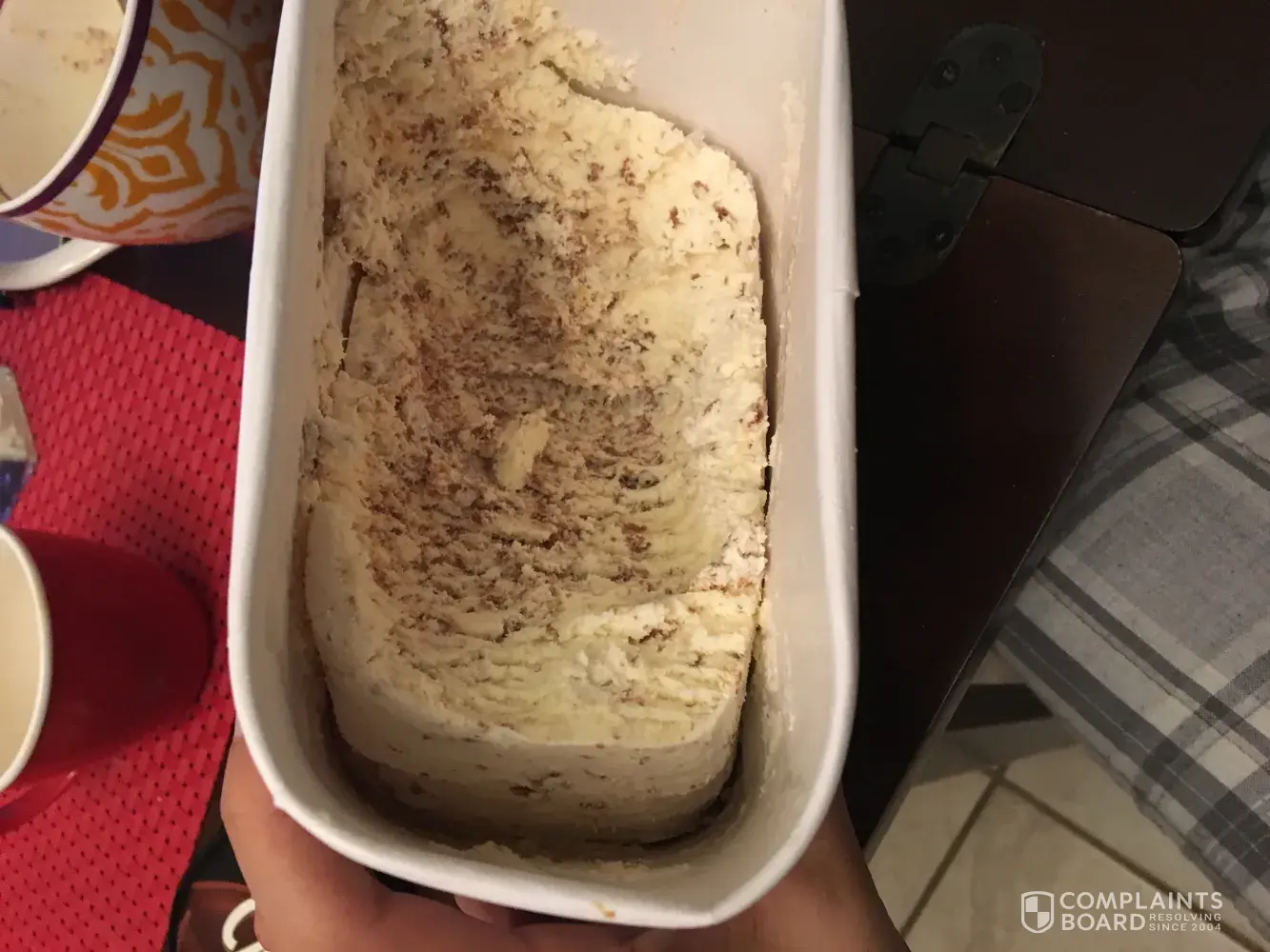 The ice cream tub was about half gone when I purchased it. There where large amounts of ice cream missing from the edges, and the top of the container. To top off my purchase the tub was also complete freezer burnt as soon as I brought it home, as I opened it right away. I normally purchase Breyers ice cream as it is a family favourite around my house, however, I have not bought Breyers ice cream since my experience. I do not know what happened to your quality control.