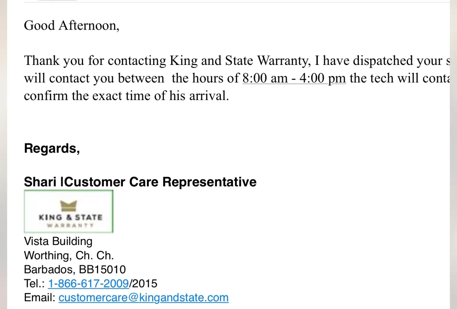 I have the same problem. King & State is a horrible company. I am waiting for a fuse to be replaced in my microwave now for 5 weeks. King & State forwarded me to TransGlobal, who then scheduled for replacing the part with Quik Repair. Quik Repair service is pathetic. Finally after 5 weeks of wait, this last Monday the technician was supposed to come in to replace the fuse. He calls me in the morning and very easily tells me that he forgot the part in his office and will not be coming in. He further told me that he cannot give me a time when he would come next. I was very upset but technician had no concern and did not even apologize. I called TransGlobal again to complain about the technician; they were least bothered. The only excuse the agent had was that he is sitting in a contact center in Edmonton and cannot do much. He then asked me to contact King & State again. And as you know the call never gets through at King& State.