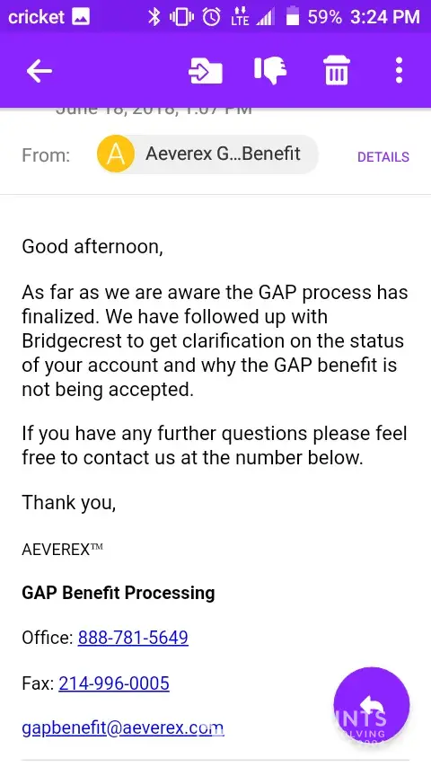 Unfortunately, a week later, nothing had been done by Bridgecrest. I called them every day for two weeks until finally, the gap insurance was processed. However, when I asked about my credit score, they told me that the 30-day late fee was because I should have continued making payments while waiting for everything to be processed. This was frustrating, as my daughter is a struggling single parent and I'm a healthcare worker, and this whole ordeal has impacted our ability to buy a house.