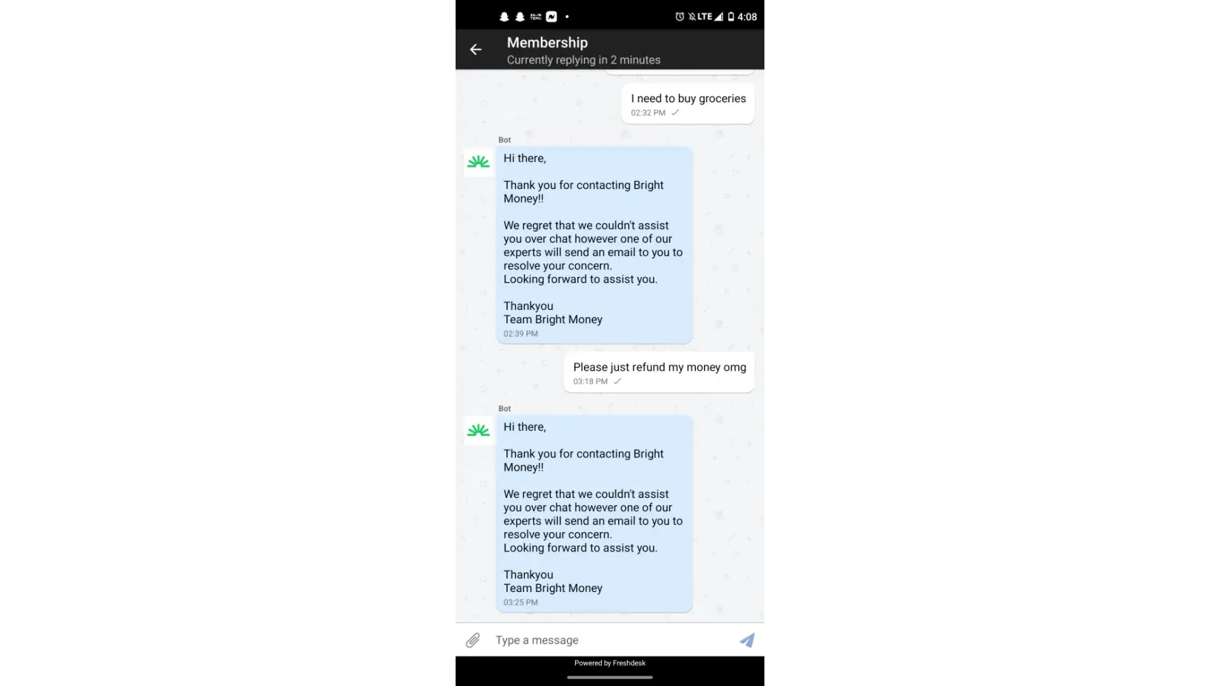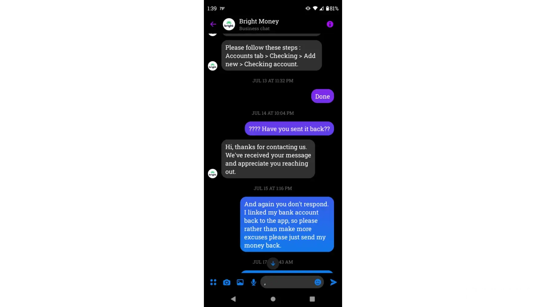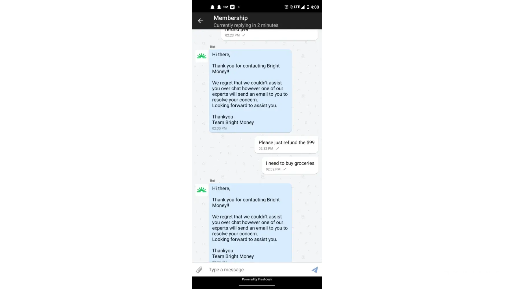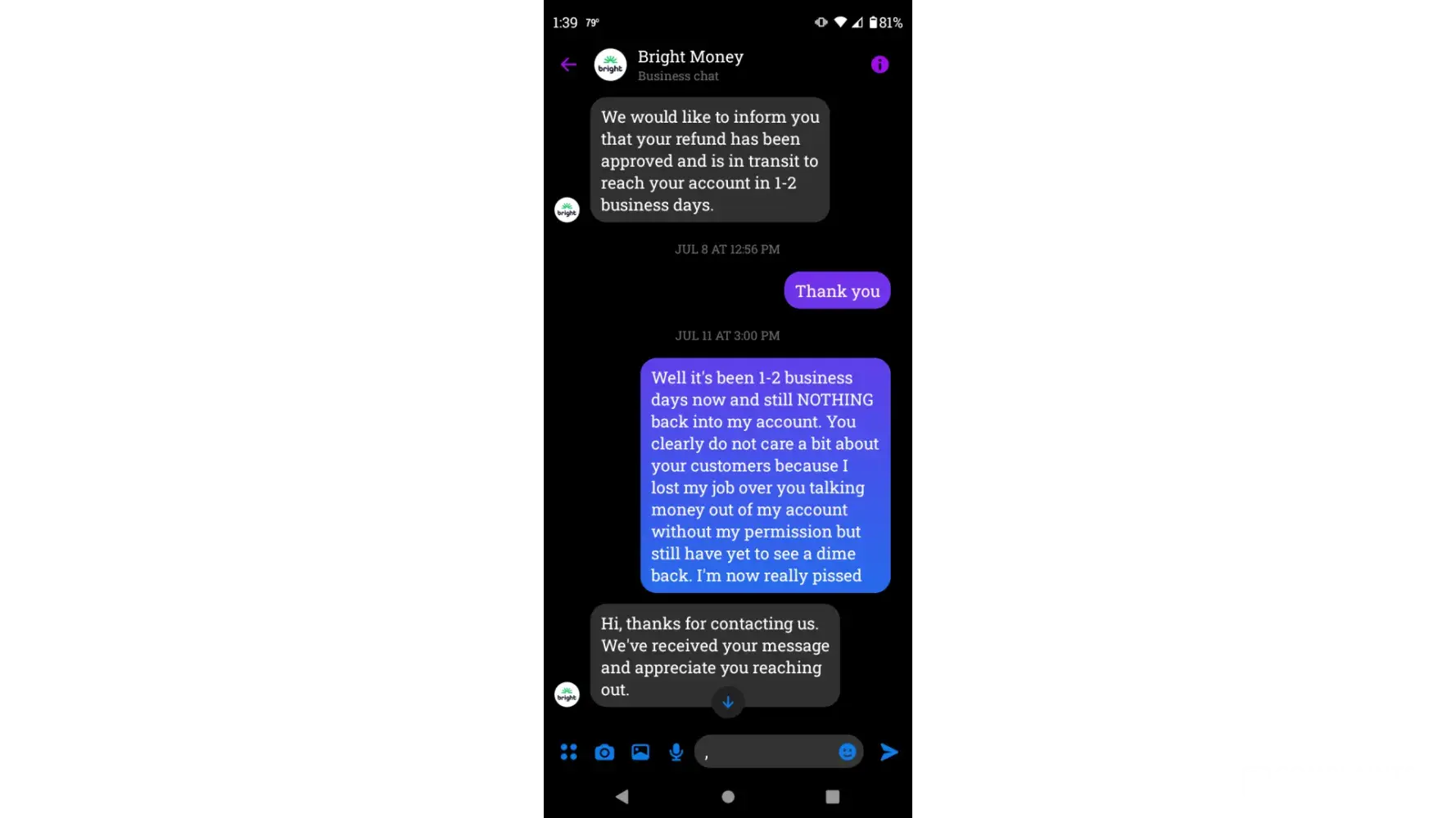 3 weeks ago bright m9ney took money from my account . I did not sign up for this. I emailed 6 times for my 99.00 dollar refund. Every email is computer generated saying I will receive my refund in 3-4 days. I tried calling their phone number no answers and refers back to email them. Starting 4 week no refund no way to contact a human. This company is not user friendly and does not refund for services not rendered. All I want is my money back. I can see that this will never happen. Do Not Use this app