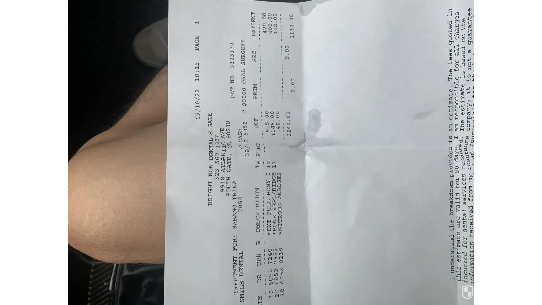 I rushed my little sister in for an infected wisdom tooth extraction. The exam and x ray appointment went very well on bright now pico rivera, and was scheduled an appointment for oral surgery at bright now south gate, on 9918 atlantic ave south gate, ca 90280 on 9/10/22 at 7am in the morning. 1st issue i had was we were there on time at 7am but we were called at 9:40AM. Also i was waiting for someone to explain to me how the procedure will be done and everything but nobody did and just straight up gave us the description on what they will do and the price. I was charged extra for stuff nobody explained to me and cost me 1100 when i only expected it to only be around 600 for one wisdom tooth extraction. They also advised us to not eat or drink 8 hours prior to surgery for no reason. We expected that she will be put in sleep for it to be painless. Since their office is running all late and they started m6y sister at 9:40am instead of 7am and other people with oral surgery at 8-10am starts to check in, i feel like they rushed the procedure and skipped vital steps, because first my sister came outside crying in severe pain, with intense bleeding and dizzy and lightheaded. She told me every lthing about the procedure was painful and they did not put her in sedation. I ended up replacing her gauze multiple times cuz its bleeding a lot. When she comes out i asked the assistant with her on post surgery care and was in a rush and just told me that she can eat everything no limitations, and she should be ok.