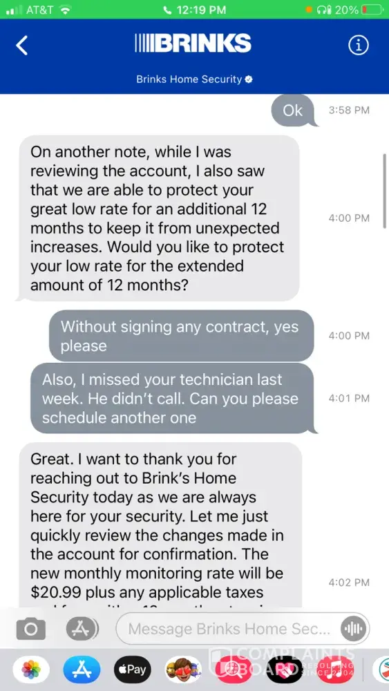 I contacted Brinks for a technical issue. During the chat session, the Brink rep asked me if I want to protect my low rate for another 12 months. He did not mention that this will increase the contract term. I was already on a contract with at least 12 months remaining in the contract.