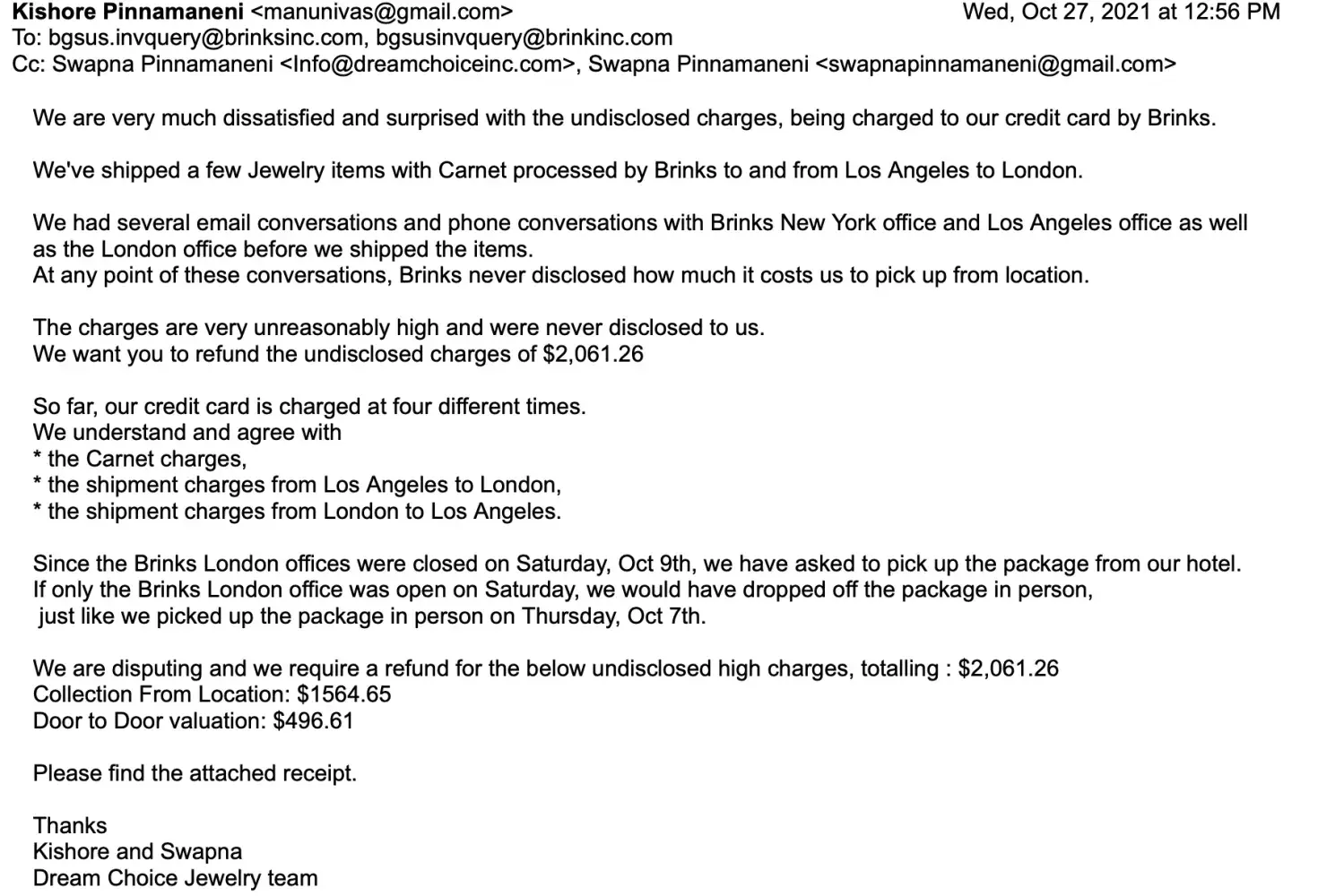 Sent emails to BGSUS.[protected]@brinksinc.com for refund of undisclosed charges on Oct 27th and Nov 11th and haven't heard anything back.