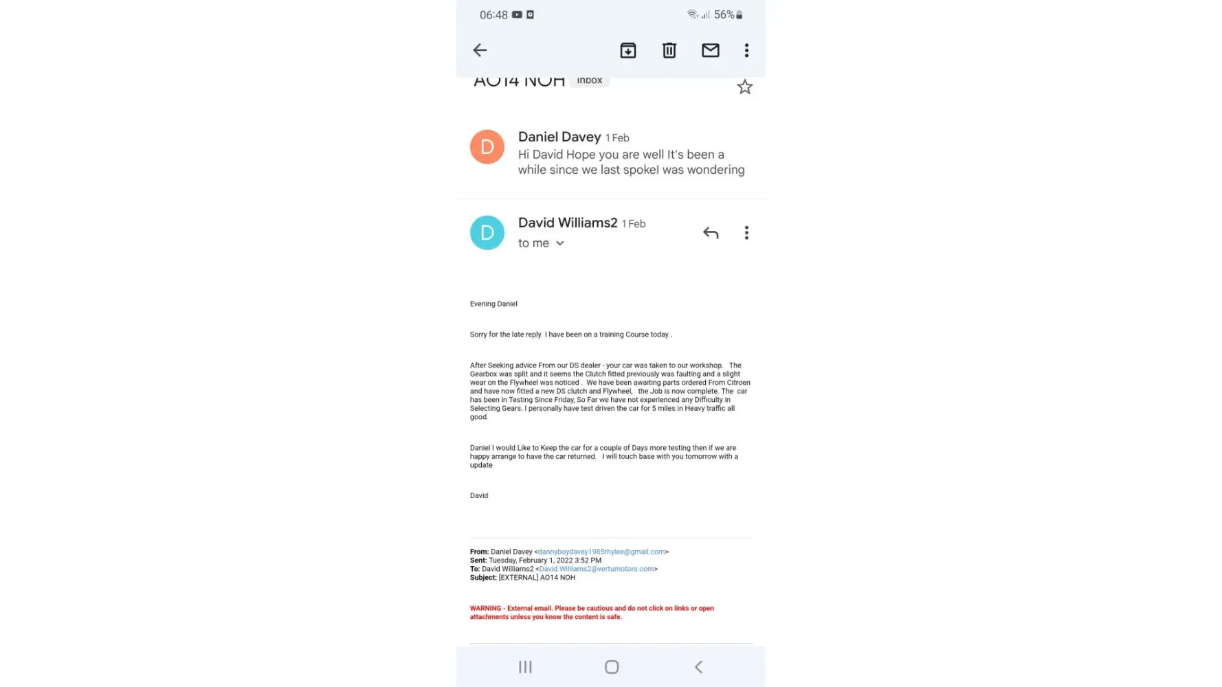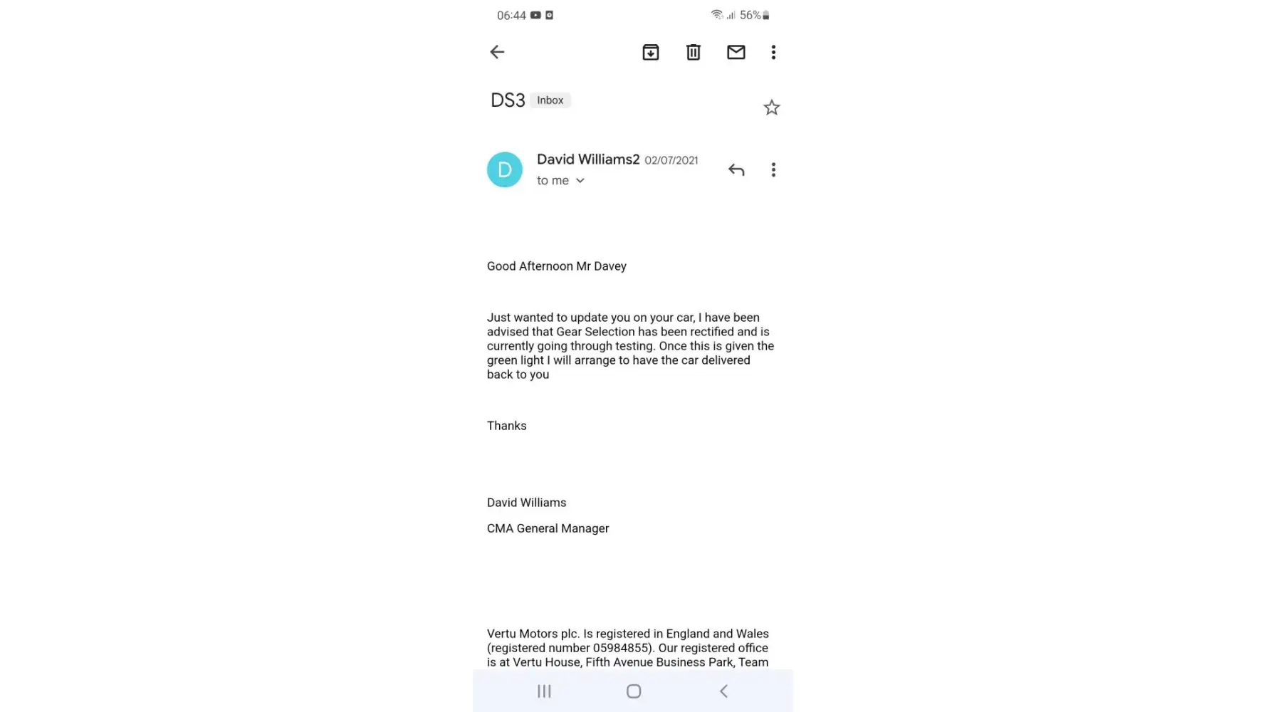 To date I have had no call back or e-mail so I have concluded that they aren't interested in customer satisfaction once you handed over your money and it's your own problem to sort out. I wouldn't recommend this dealer to anyone and if you are thinking of purchasing a car from them be very wary!