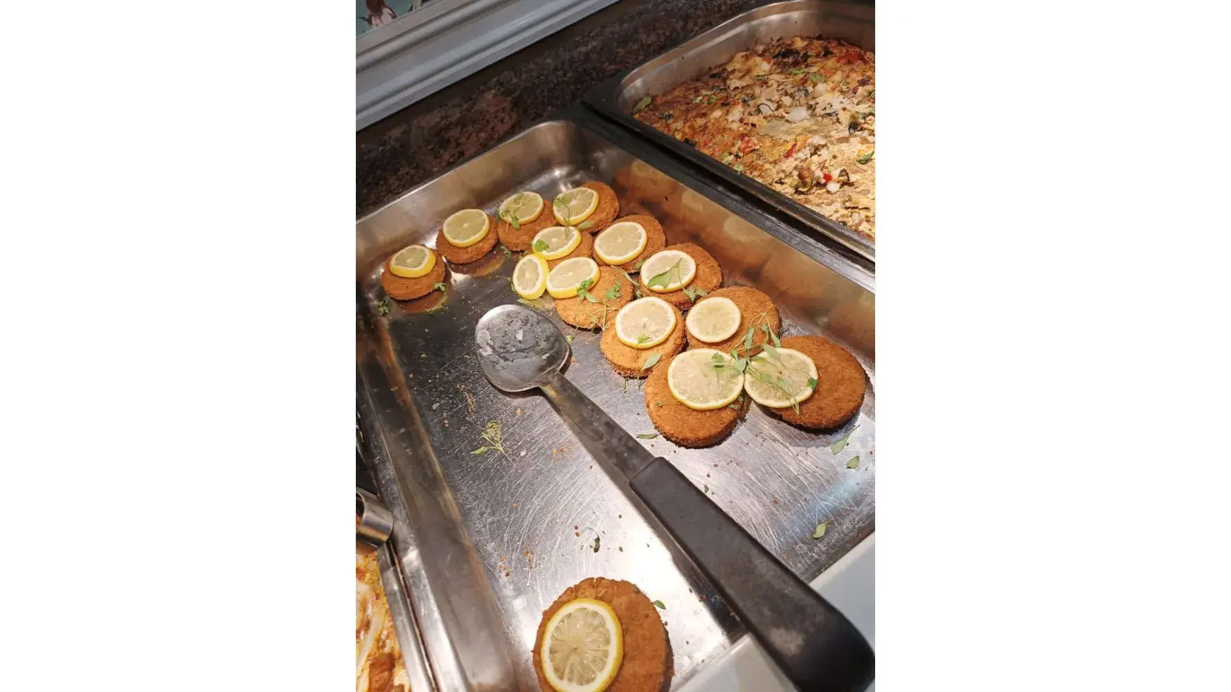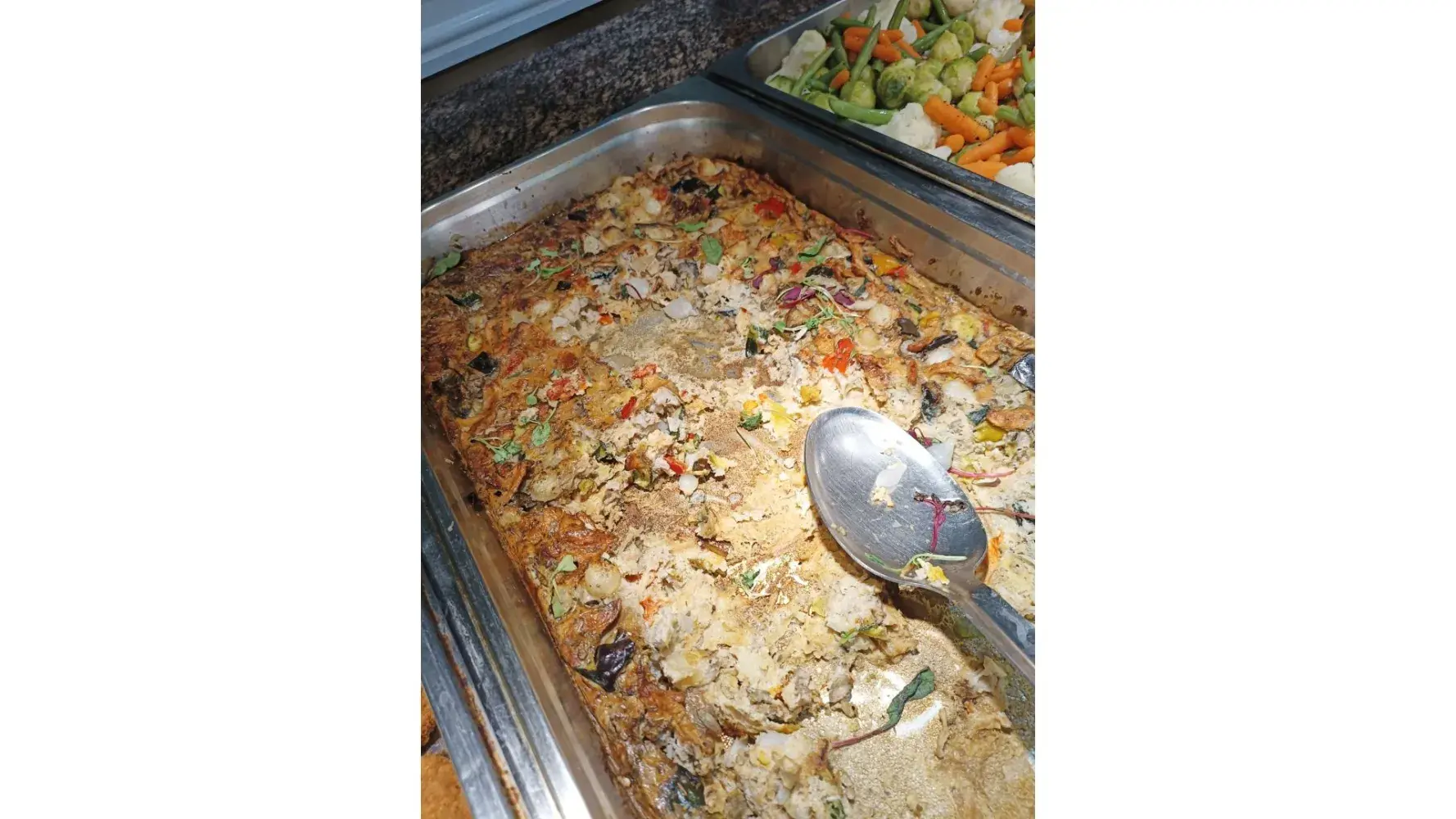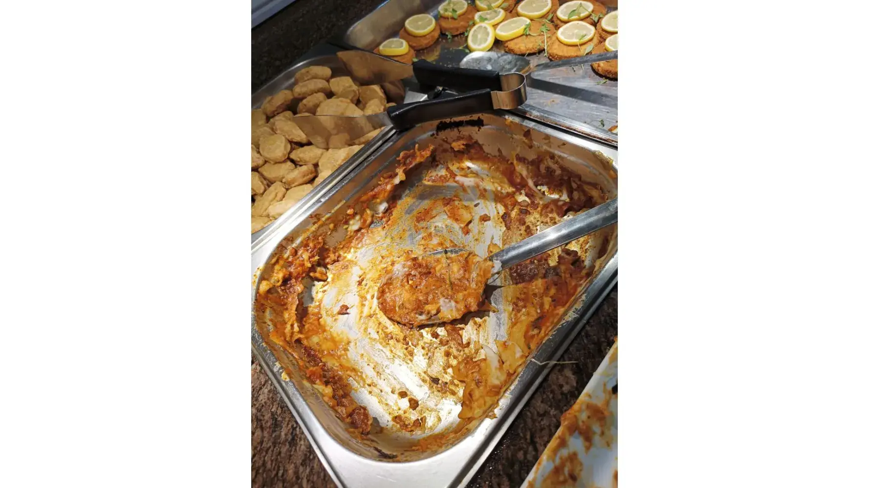 as photos show bought in frozen fishcakes, chicken nuggets, frittata that had been overcooked and grey and lasagne not replaced all served with roast potatoes