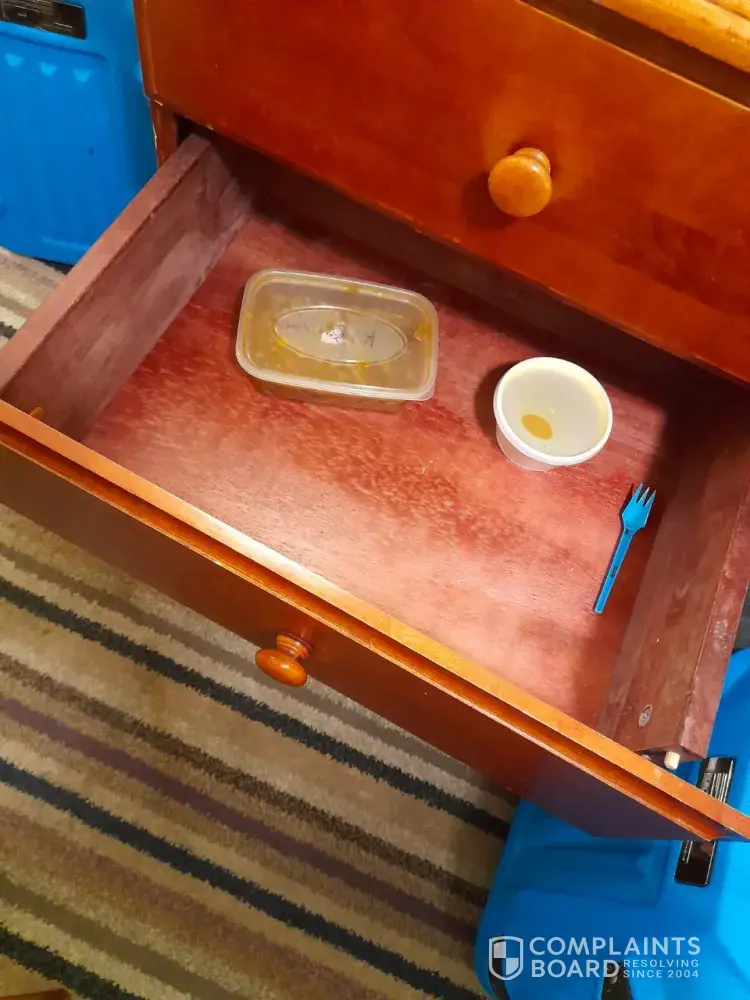 On arrival we were allocated room 149, as soon as we walked in the stench was awful and on investigation there were curry containers in the drawers, shot glasses and plastic glasses behind the armchairs. There were Haribo sweets under the chairs and chest drawers (photos are attached). The room was in a very bad state of repair, the drawer was off the Chester drawers and just placed on top - definite health & safety issue. Radiator was falling apart. Muck on Reception sign.