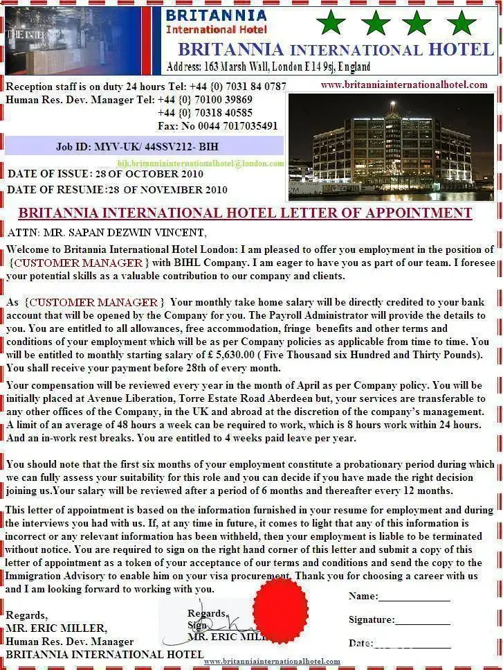 You will contact him and he shall assist you in timely obtaining of your necessary residence and a work permit papers/ VISA with the United Kingdom Immigration Services.