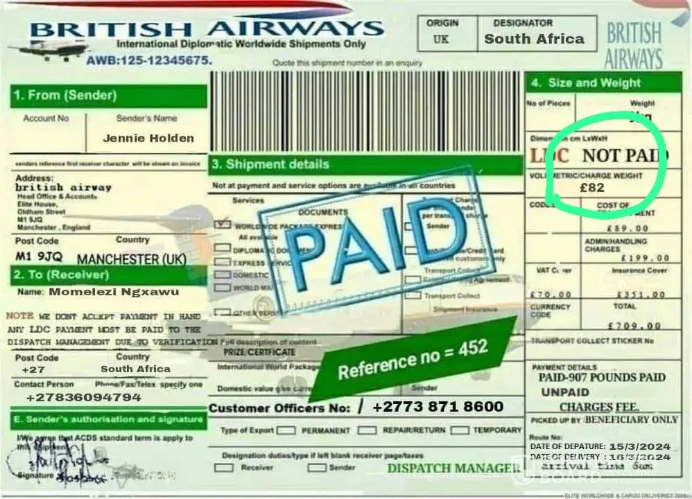Hi the is a problem I'm so confused the is this guy who told me that I must Deposit R2000 for delivery +[protected] I just want to know is he work british airways or is a scammer can someone help me