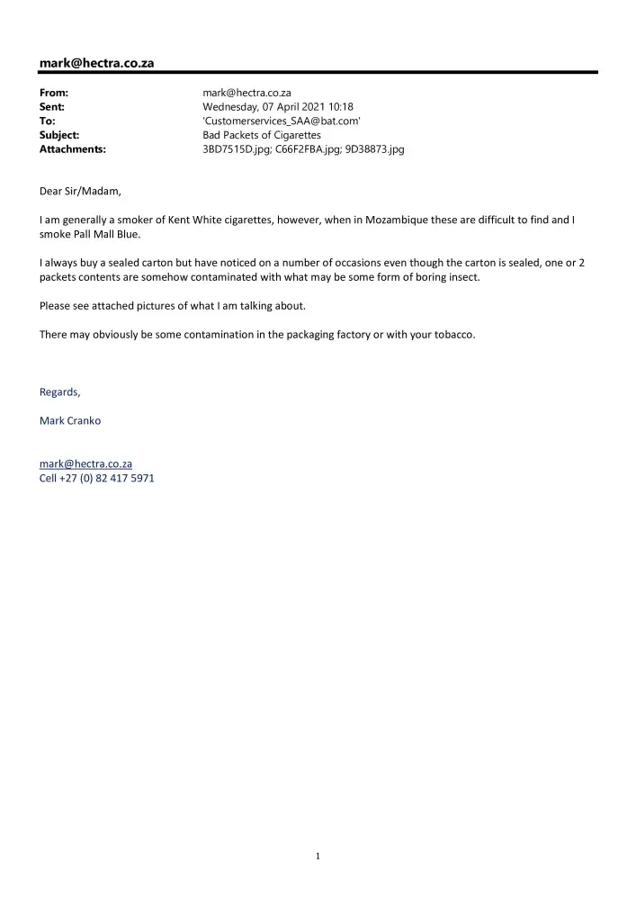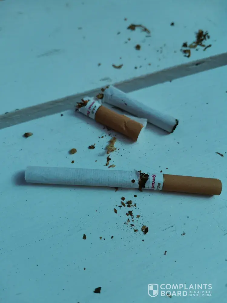 Iwould like to complain about the above product im a smoker of 50 years this has never happened before, I purchased in nicosia cyprus last wednesday pall mall violet slims after I opened them I noticed small holes in the cigarettes the package was undisturbed on the exterior, I threw some of them away when I got to the last few I noticed debris in the bottom of the pack I emptied it out and there was small worms and a small brown bug I have photo and video evidence of the bug actually moving, I called the [protected] number and spoke to a lady explaining what had happened she was horrified and assured me that someone from the office a mr fotis would call to collect the pack and the by now dead bug to be sent for analysis, that was wednesday today is saturday great customer service, my daughter is encouraging me to go to the consumers complaints in nicosia and flood the social media with the video and photos, but im not that vindictive having said that I am getting very annoyed that this complaint is not being taken very serious.