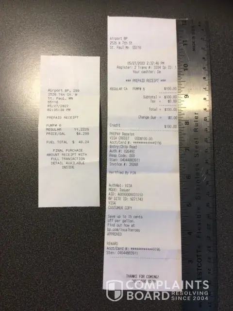 On 12/09/2021 @ 14:36 hrs I told the cashier (who refused his name) $15 on pump 6 I swiped my card got the receipt started pumping gas I began to clear my rear window wiper from leaf debris when I noticed the pump exceeded the $15 so I stopped the pump went inside told the cashier what happened. The cashier instructed me to turn the pump off (which I had already done) and gave me a receipt for $22 stating it would reflect later it is now 12/11/2021 and my money has not been returned to my account. They refuse to answer the phone number given. On 12/10/2021 I called again left my number no response. Can you resolve this simple issue of $27.95? BP site UD says 9743386 address is 17460 S. Kedzie Av. Hazelcrest, Ill 60429 invoice#162602
